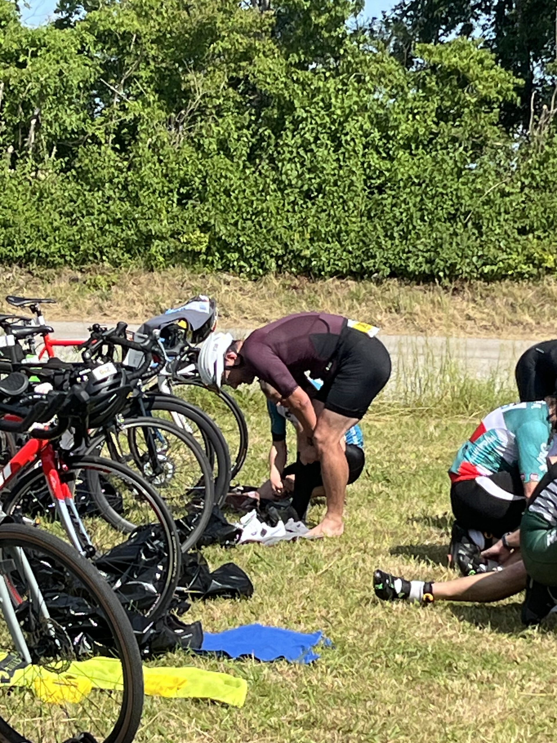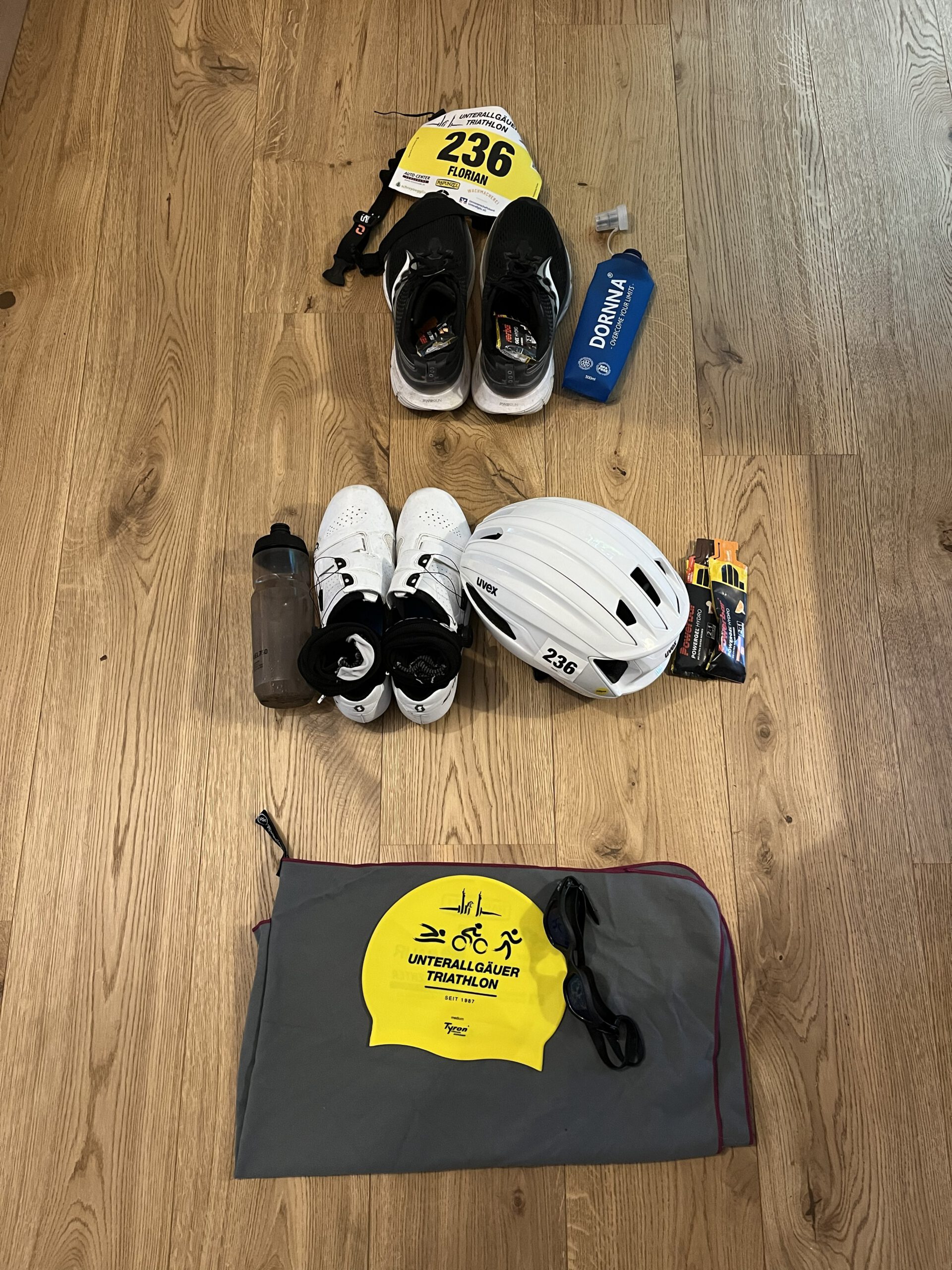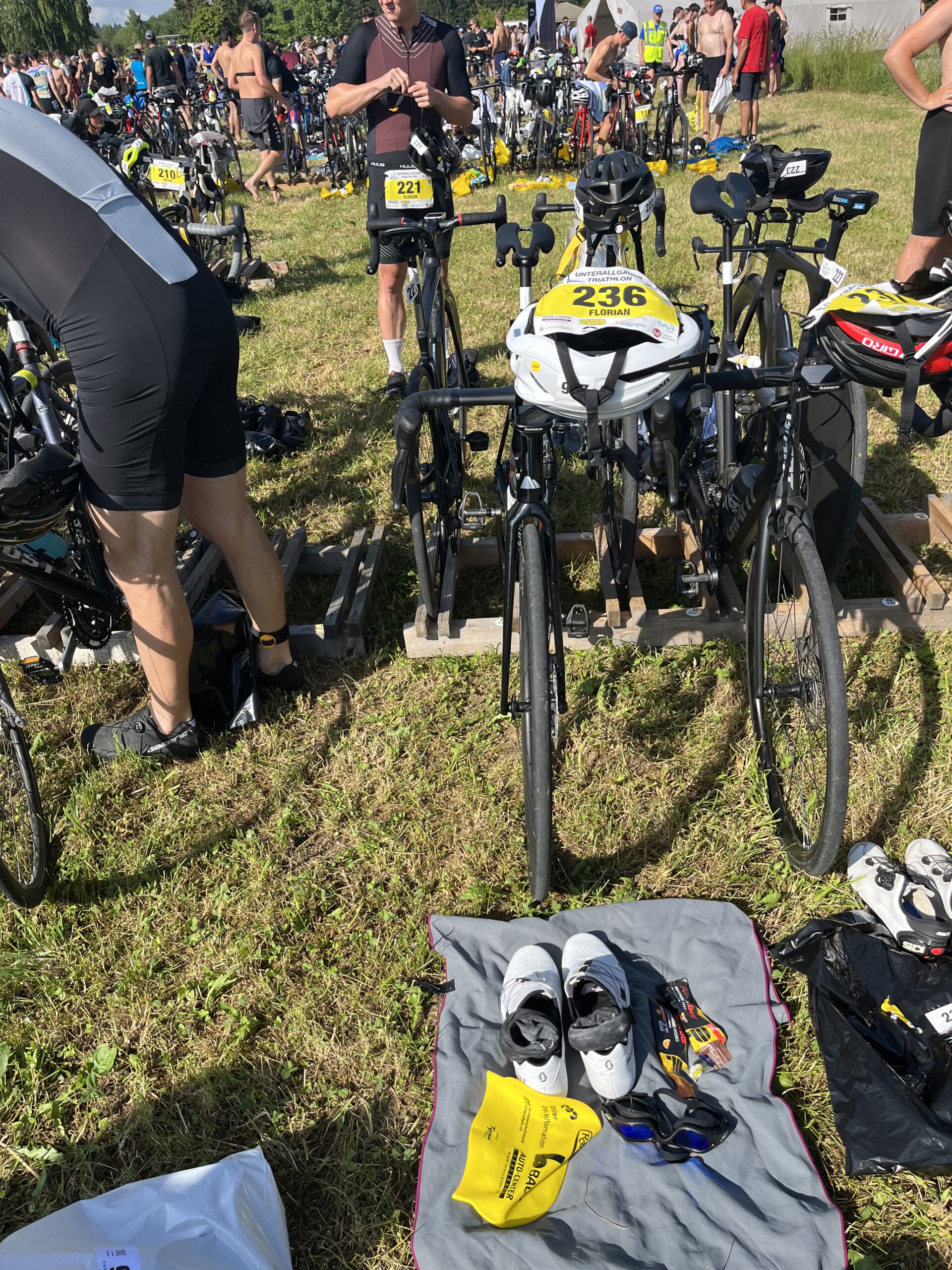 Aber weiter gehts, Rad-Check absolvieren. Wechselplatz einrichten. Klamotten sortieren – alles wieder nach exakt einstudierter Reihenfolge. Man lernt ja aus dem Vorjahr. Helm, Brille, Schuhe. Alles hat seinen Platz und seine Richtigkeit. Zudem… Startnummer Wasserfest auf meinen Arm geschrieben… aus Fehlern lernt man.