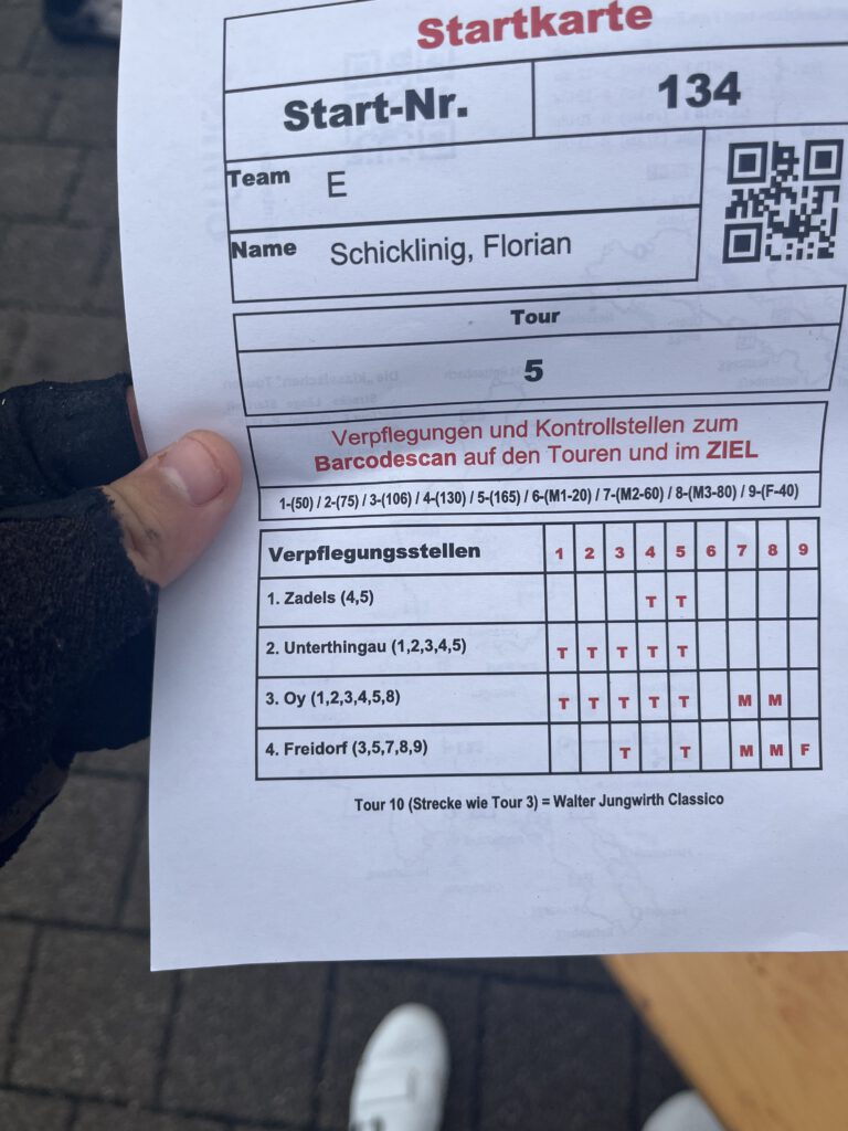 Hoochi brachte mich zurück nach Durach. Mein „Goody“ hab ich vom Veranstalter trotzdem bekommen – bis auf zwei Checkpoints (1,5KM vor dem vorletzten Checkpoint) waren alle anderen gestempelt, und es hatte sich auch schon rumgesprochen, dass ich einen Schaden hatte. Am Rad. *zwinker*