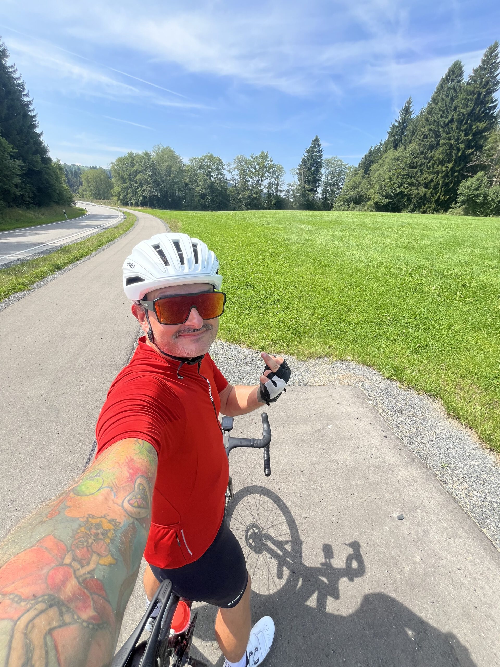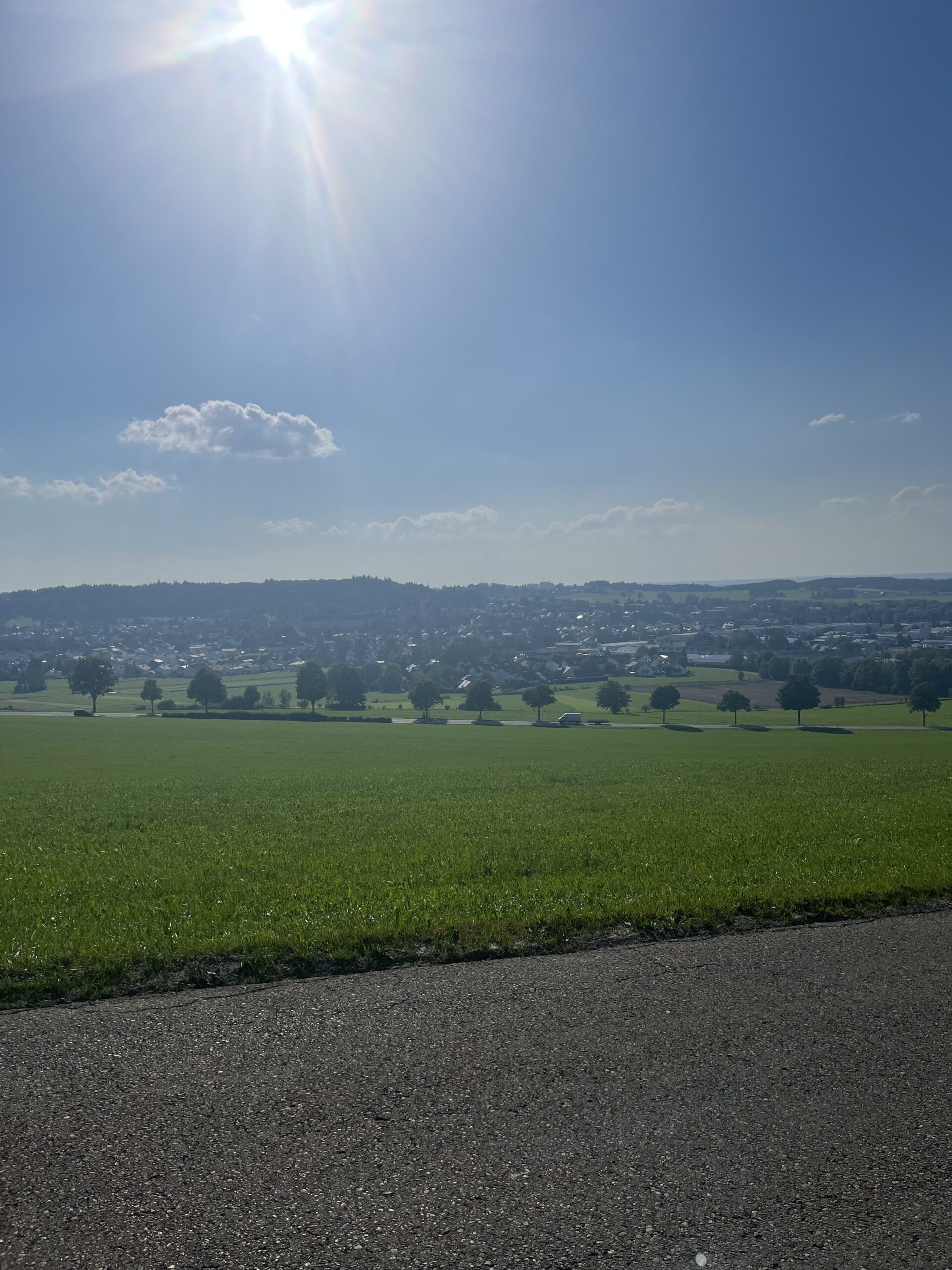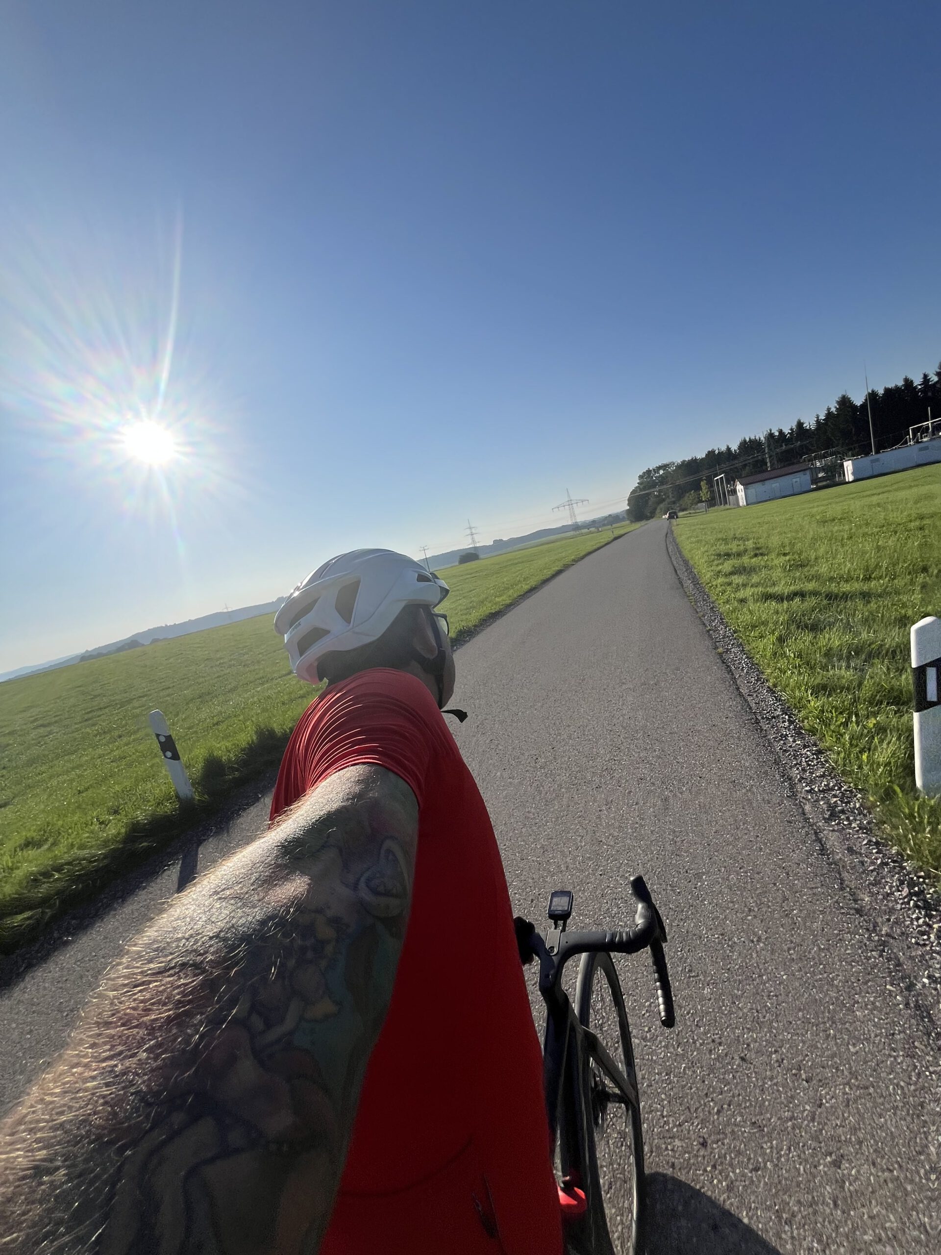 Ich hatte meinen Startpunkt vergessen und war tatsächlich noch weit vom Ende entfernt. Bedeutet: nochmal gute 50–60 km. Flaschen mittlerweile leer. Und vor mir ein Anstieg, den ich normalerweise liebe – normalerweise. Hopferbach hoch nach Eschers. An dem Tag? Zu dem Zeitpunkt? Fuck you! Klar, ich hätte auch einfach quasi geradeaus nach Hause fahren können, aber ich wollte diese Runde zu Ende bringen.