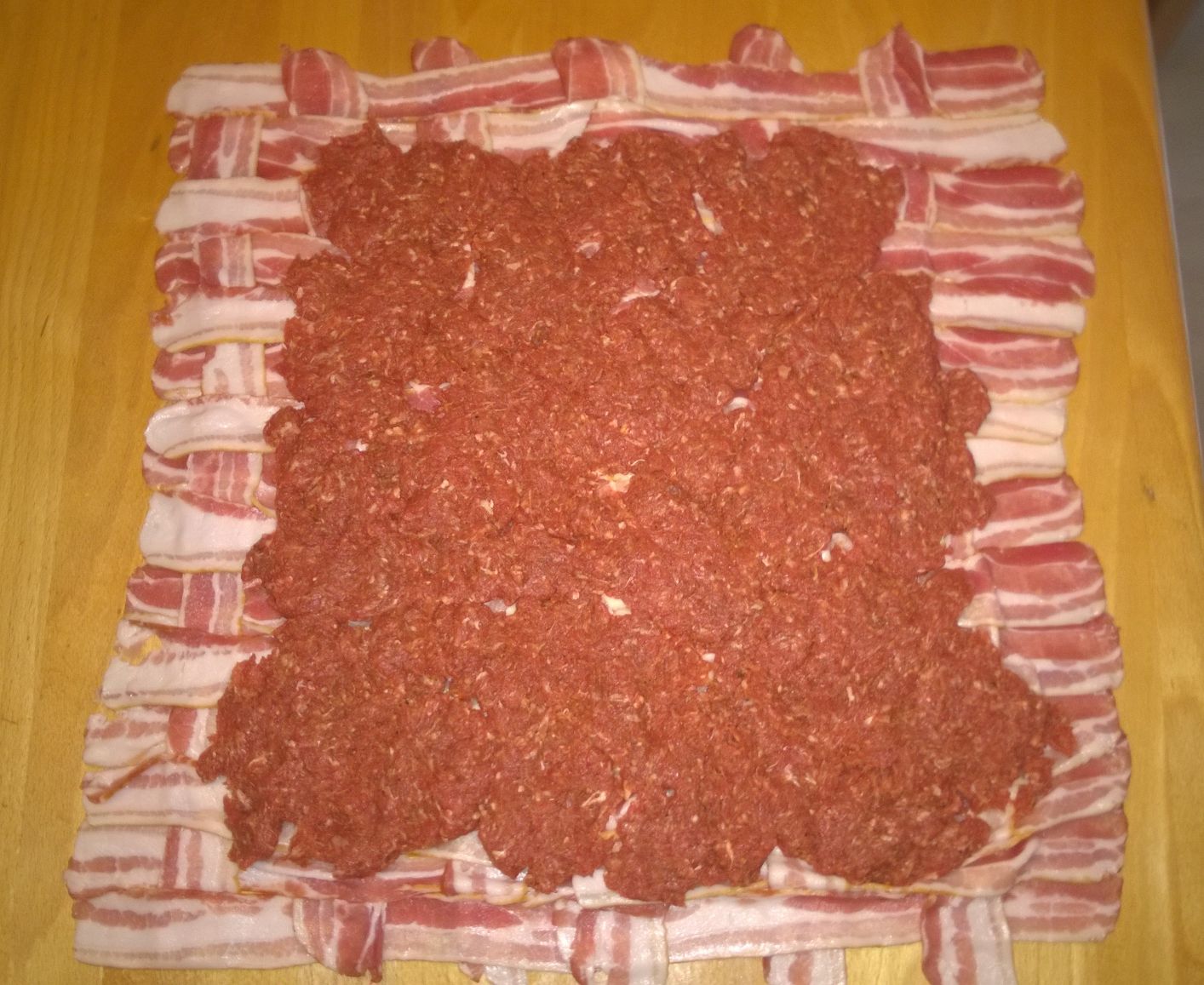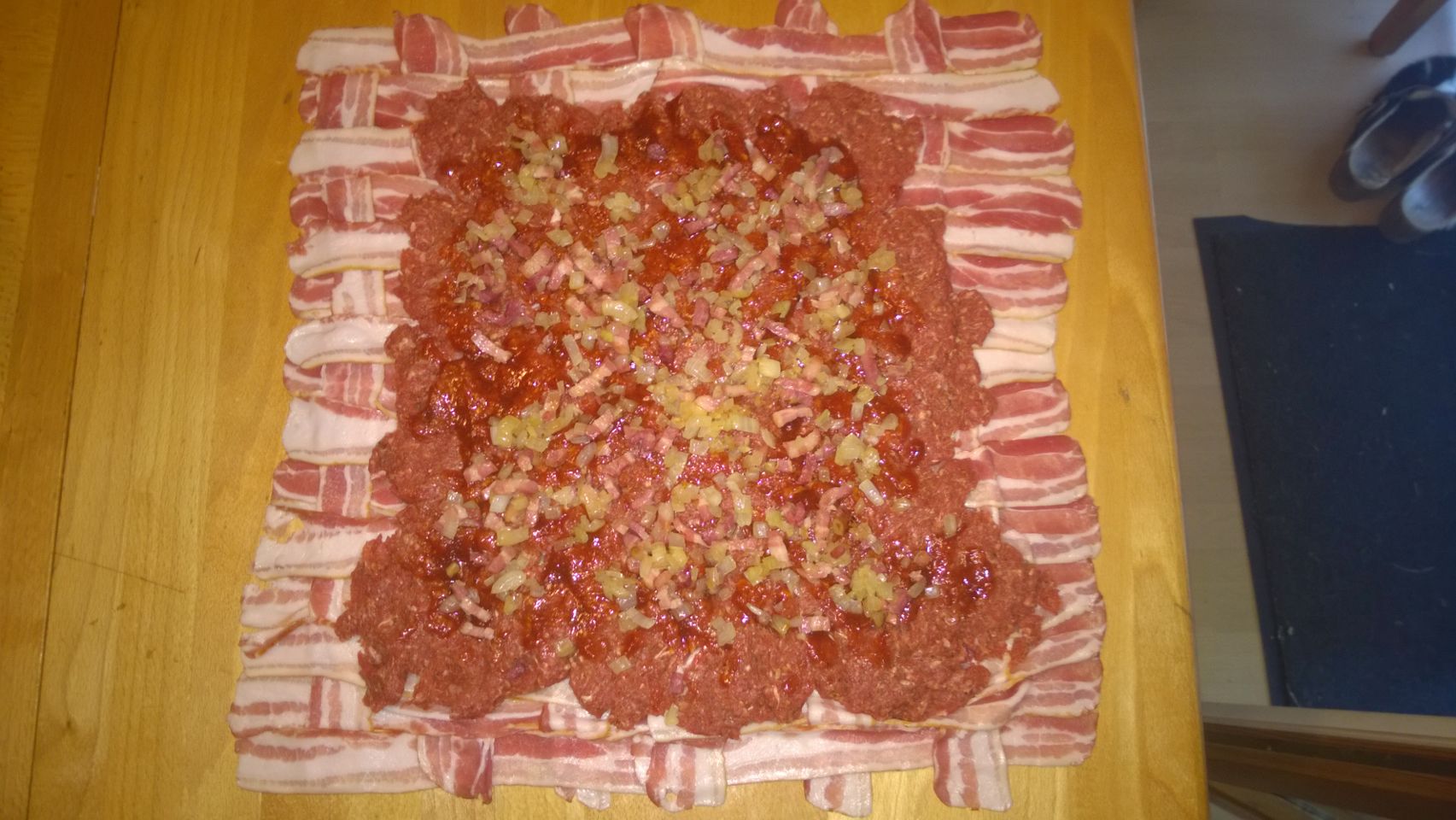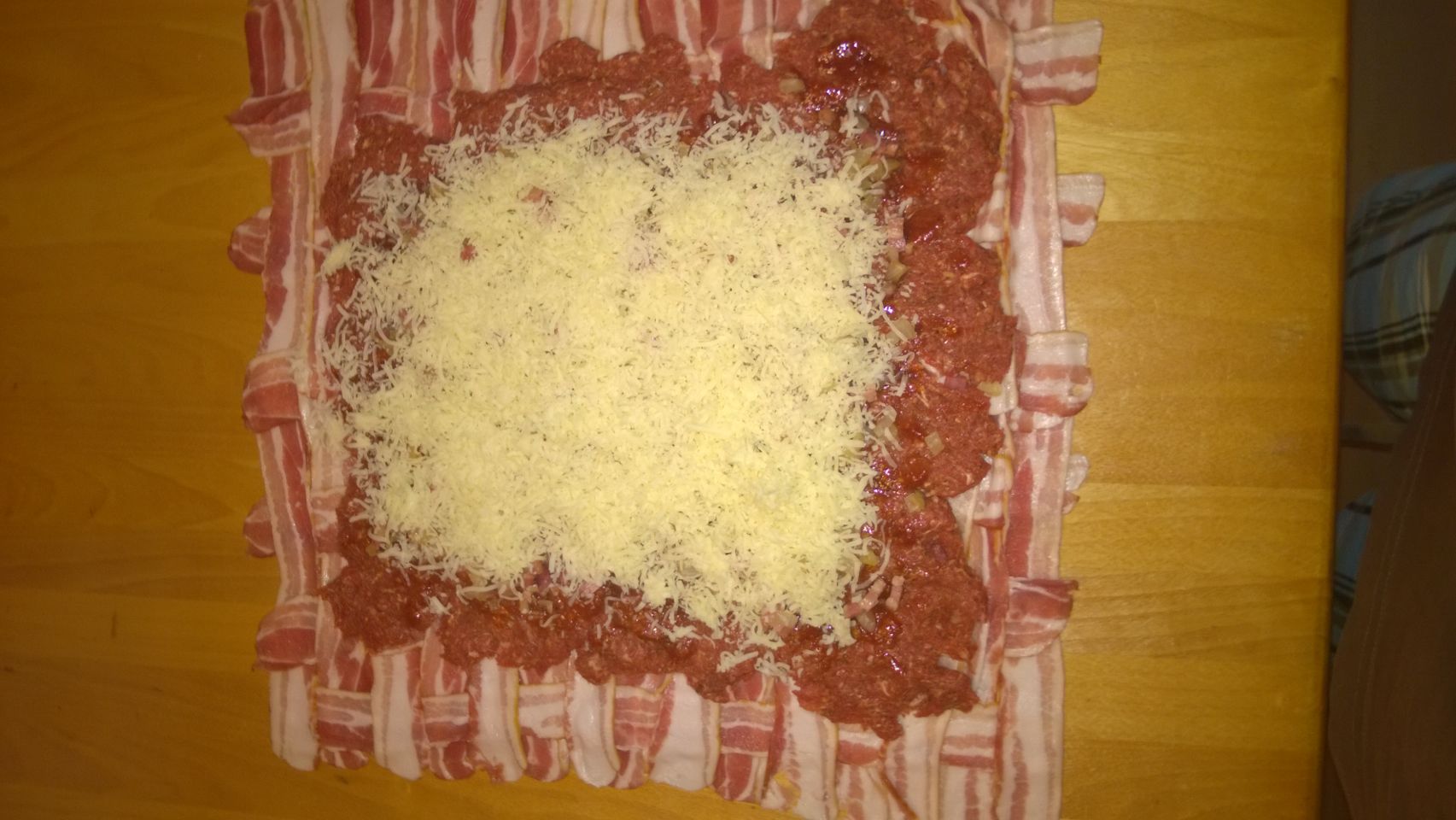 Bacon zu einem Netz auslegen und das Hackfleisch und der Käse darauf verteilen