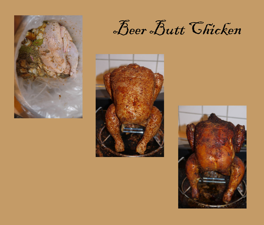 Am nächsten Tag abtupfen und mit der trockenen Marinade einreiben. Die Bierdose oder die anderen Gefe zu 2/3 mit Bier füllen und dem Huhn rektal einführen. Auf die Bierdose stellen und in den geschlossenen Kugelgrill oder in den Ofen bei 180-200 Grad ca. 45-60 Minuten.