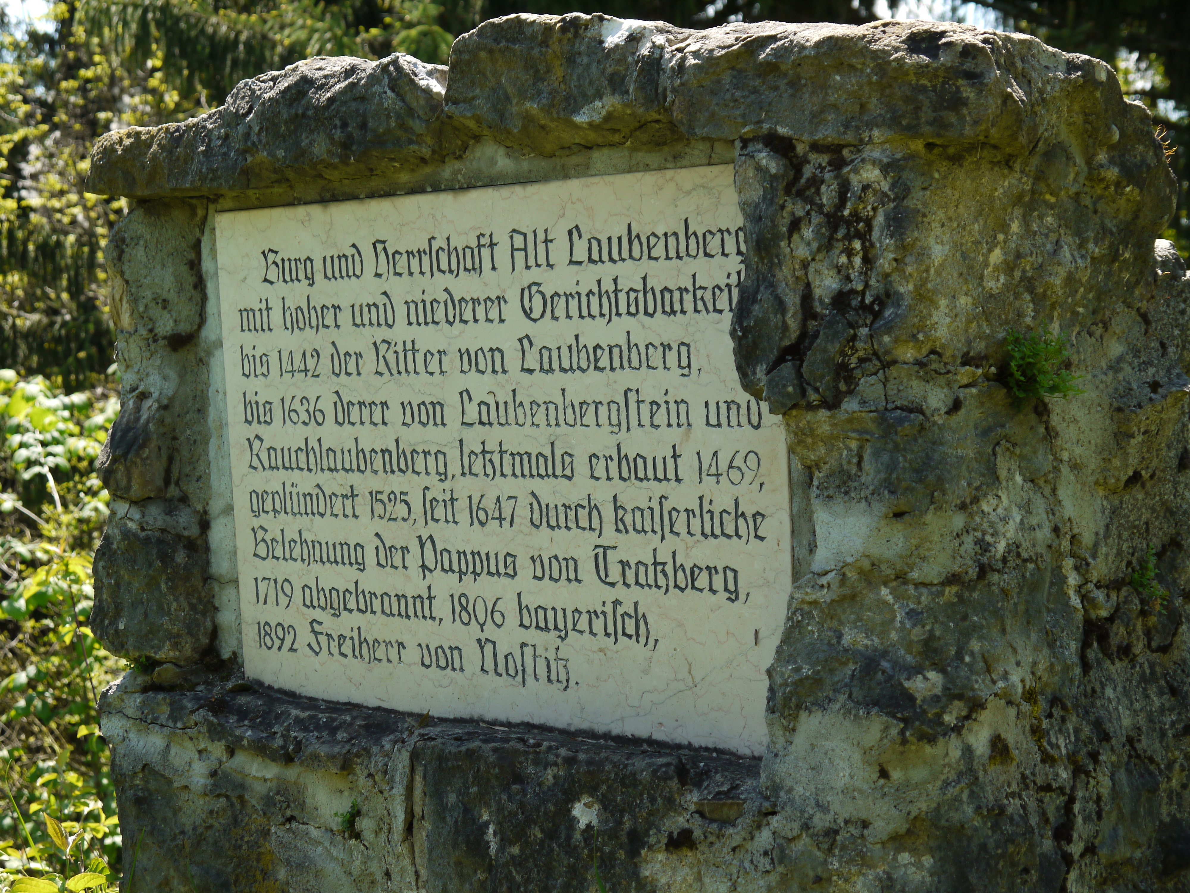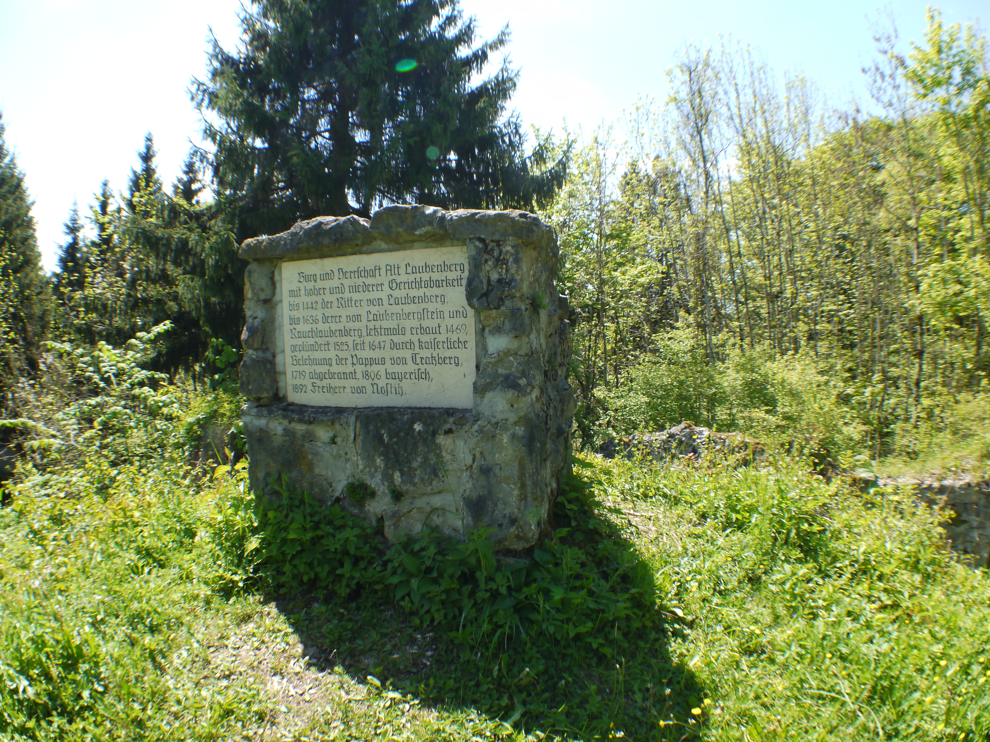 Die Burg Alt-Laubenberg brannte 1719 nach einem Blitzeinschlag ab, und wurde daraufhin nicht wieder aufgebaut. 1801 wurde aus der Ruine Steine für die abgebrannte Tavern-Wirtschaft im benachbarten Schönau gebrochen. 1806 gelangte die Burgruine an Bayern, 1892 kam sie an die Freiherren von Nostitz.