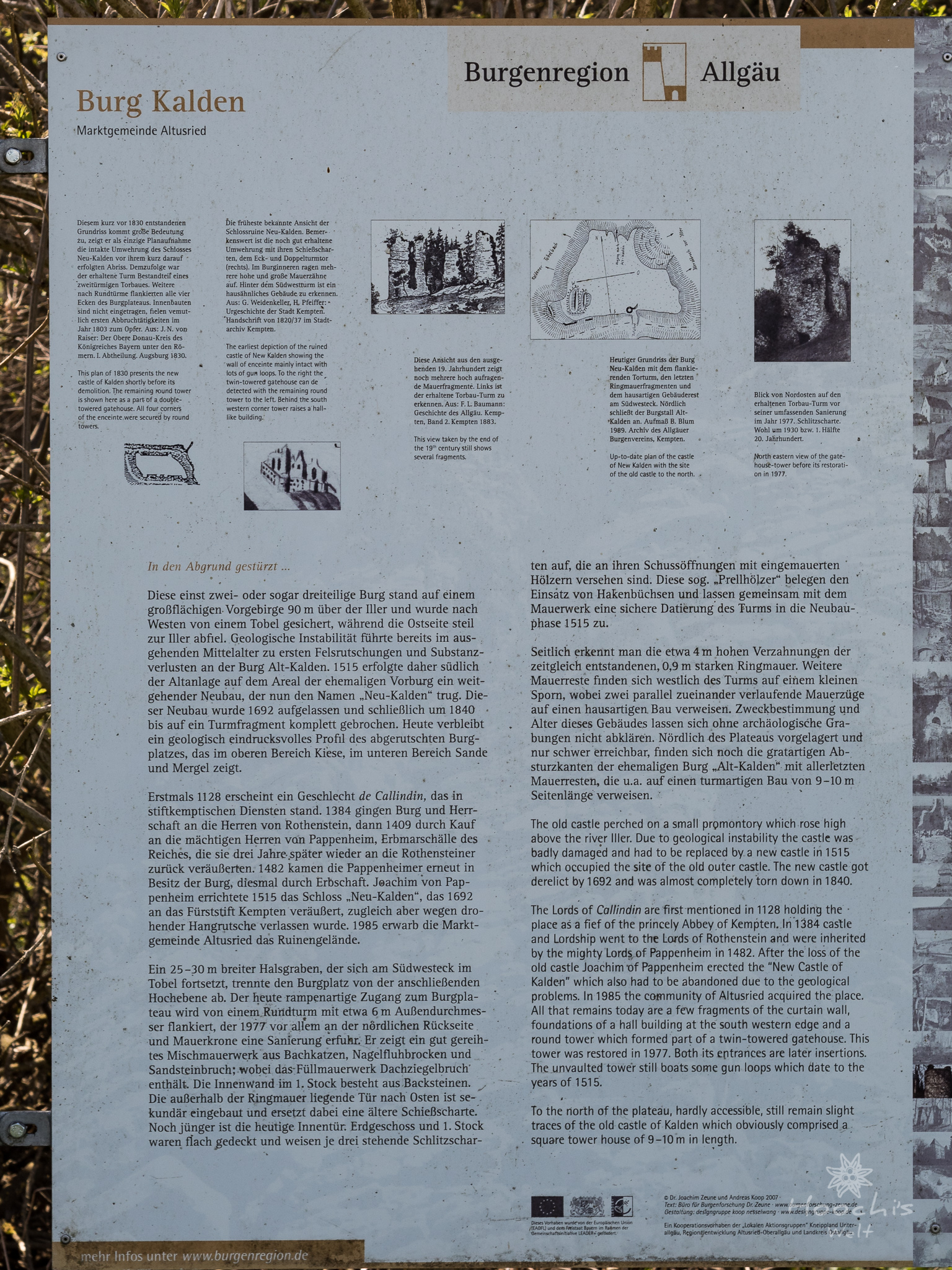 Erstmals 1128 erscheint ein Geschlecht der Callindin, das in stiftkemptischen Diensten stand. 1384 gingen Burg und Herrschaft an die Herren von Rothenstein, dann 1409 durch Kauf an die mächtigen Herren von Pappenheim, Erbmarschälle des Reiches, die sie drei Jahre später wieder an die Rothensteiner zurückveräußerten. 1482 kamen die Pappenheimer erneut in den Besitz der Burg, diesmal durch Erbschaft. Joachim von Pappenheim errichtete 1515 das Schloss Neu-Kalden, das 1692 an das Fürststift Kempten veräußert, zugleich aber wegen drohender Hangrutsche verlassen wurde.