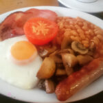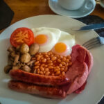 Um 7 Uhr klingelte der Wecker, damit wir um 8 Uhr zum frühstücken gehen konnten. Wofür hat denn Flo auch sonst das Bed&Breakfast gebucht? 🙂 Und inzwischen kann auch ich morgens schon Haufen futtern. Los ging es mit Spiegeleier, Toastbrot, Marmelade, Kaffee und Orangensaft.