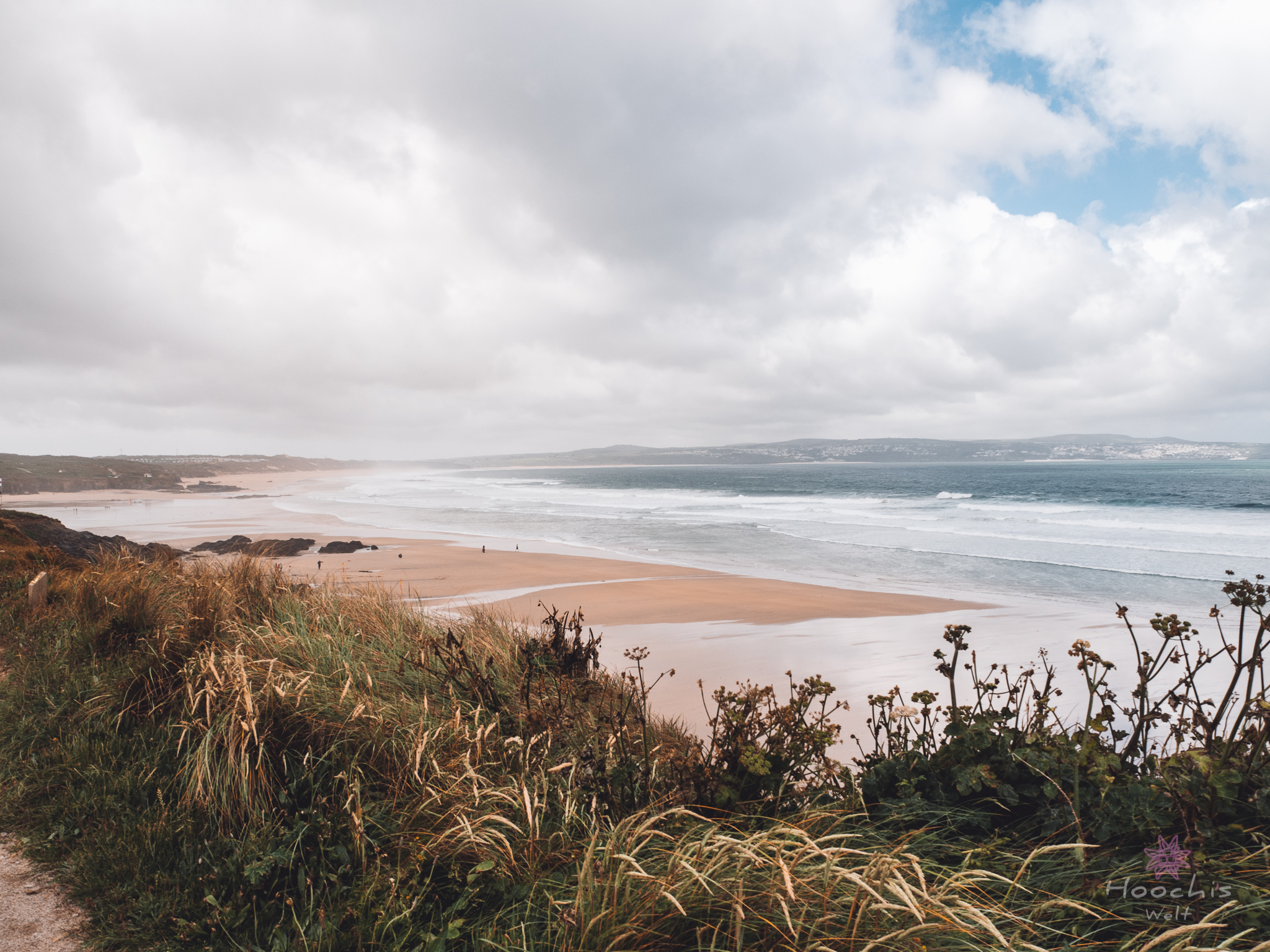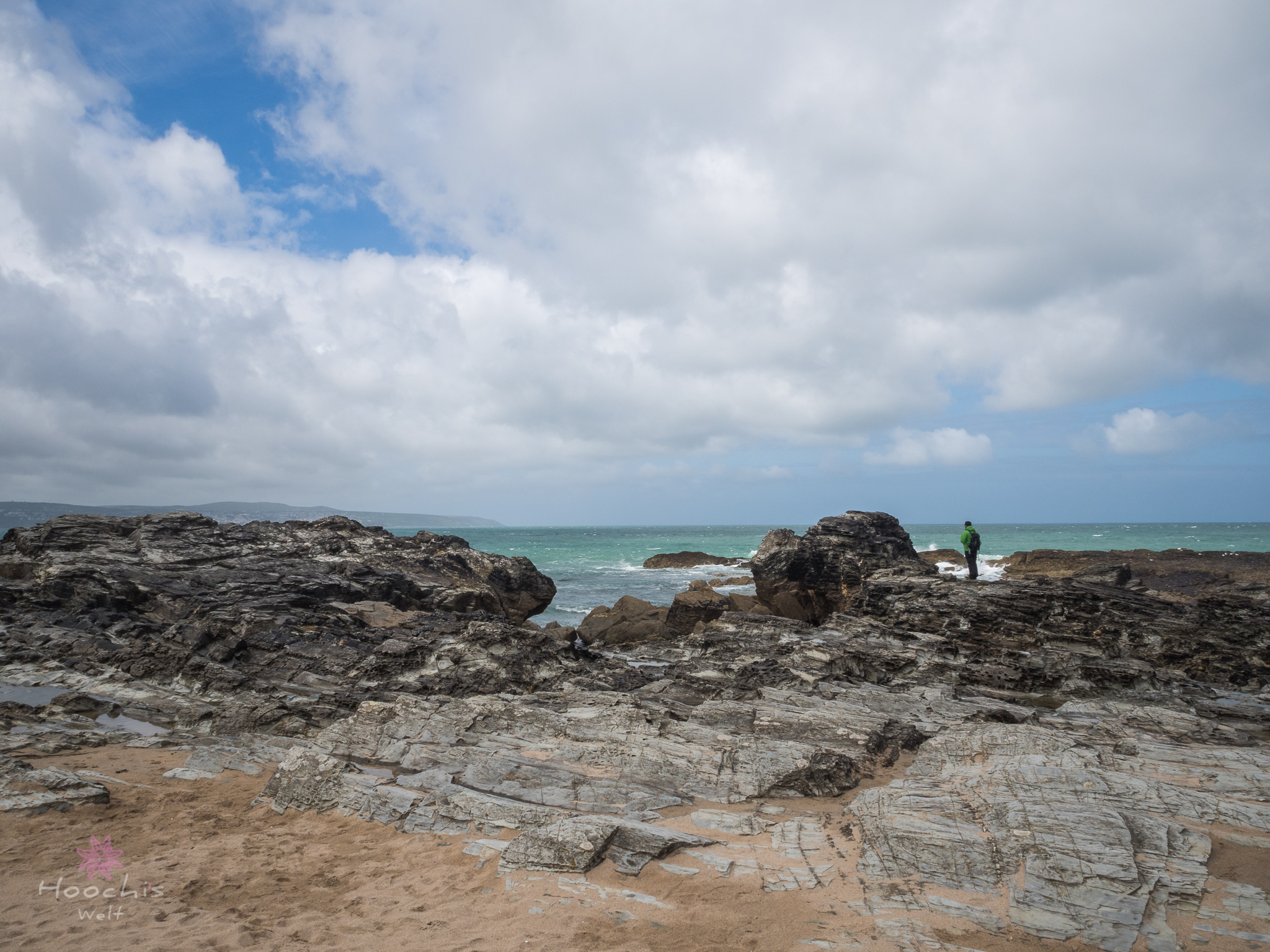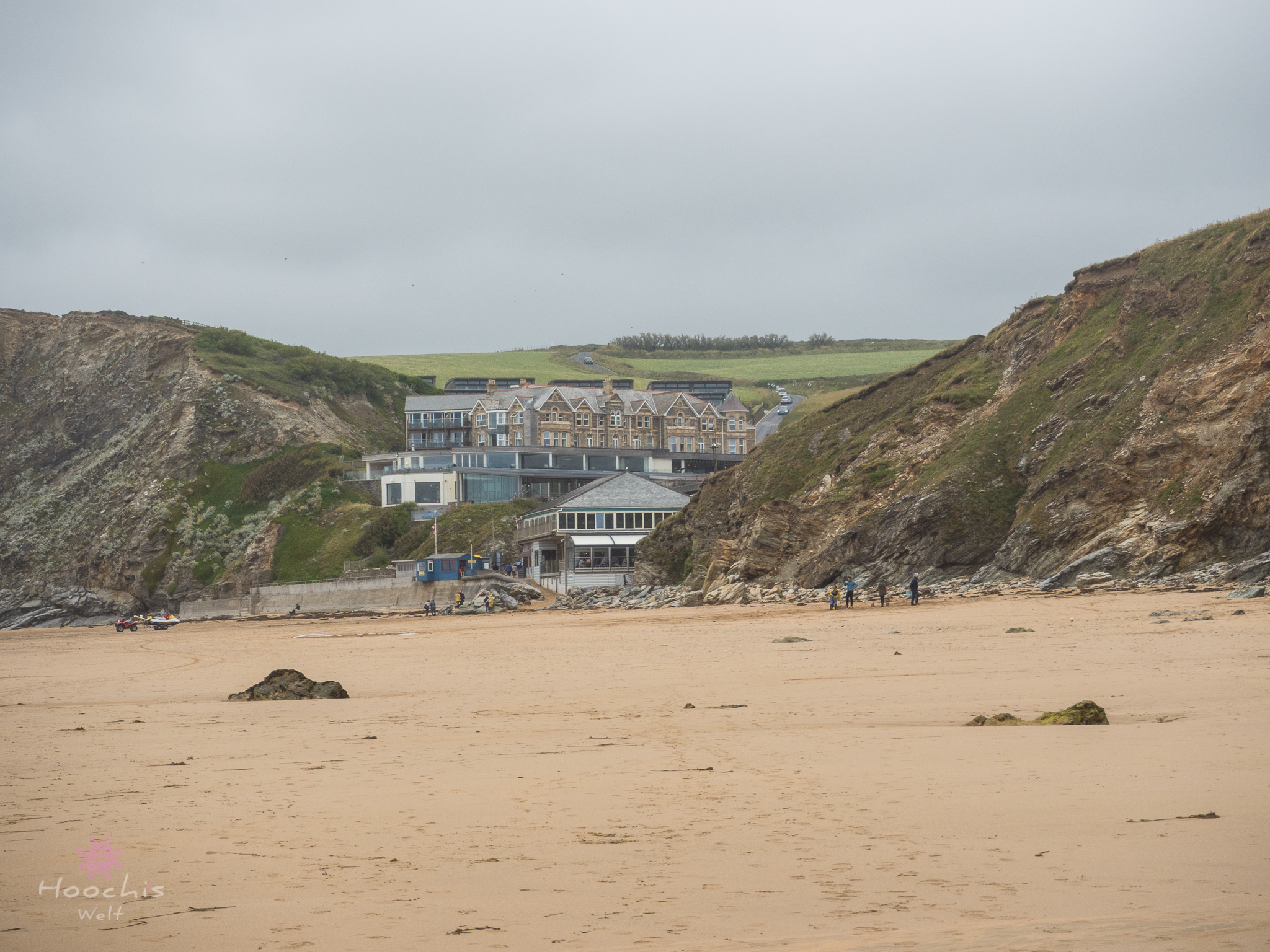 Anschließend fuhren wir zu Watergate Bay. Das ist einer DER Surferstrände in Cornwall und Jamie Oliver hat dort sein Restaurant „fifteen“. Ich hoffe, das sagt euch was. Da es windete waren wir guter Dinge auch ein paar Surfer zu sehen. Und tatsächlich sahen wir auch ein welche. Wir schlenderten den Strand entlang bis es begann richtig zu regnen.