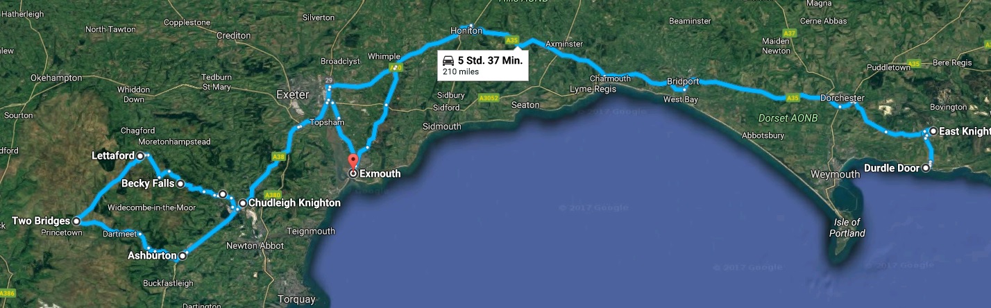 Das war uns aber noch nicht genug und der Tag war noch so lange. Also setzten wir uns erneut in unser Hybridauto und fuhren weiter nach Lettaford, Mannaton und den Becky Falls. Dort hielten wir an, um gleich wieder weiter zu fahren. Denn dieser Wasserfall kostete Eintritt und zwar £8,25. Und das war es uns nicht wert. Also fuhren wir weiter nach West Lulworth. Ja, du liest richtig. Wir sind leicht nach rechts gefahren, wenn man so die Karte betrachtet. Die Strecke gibt es natürlich wieder später zu betrachten. Also nur Geduld. 😛