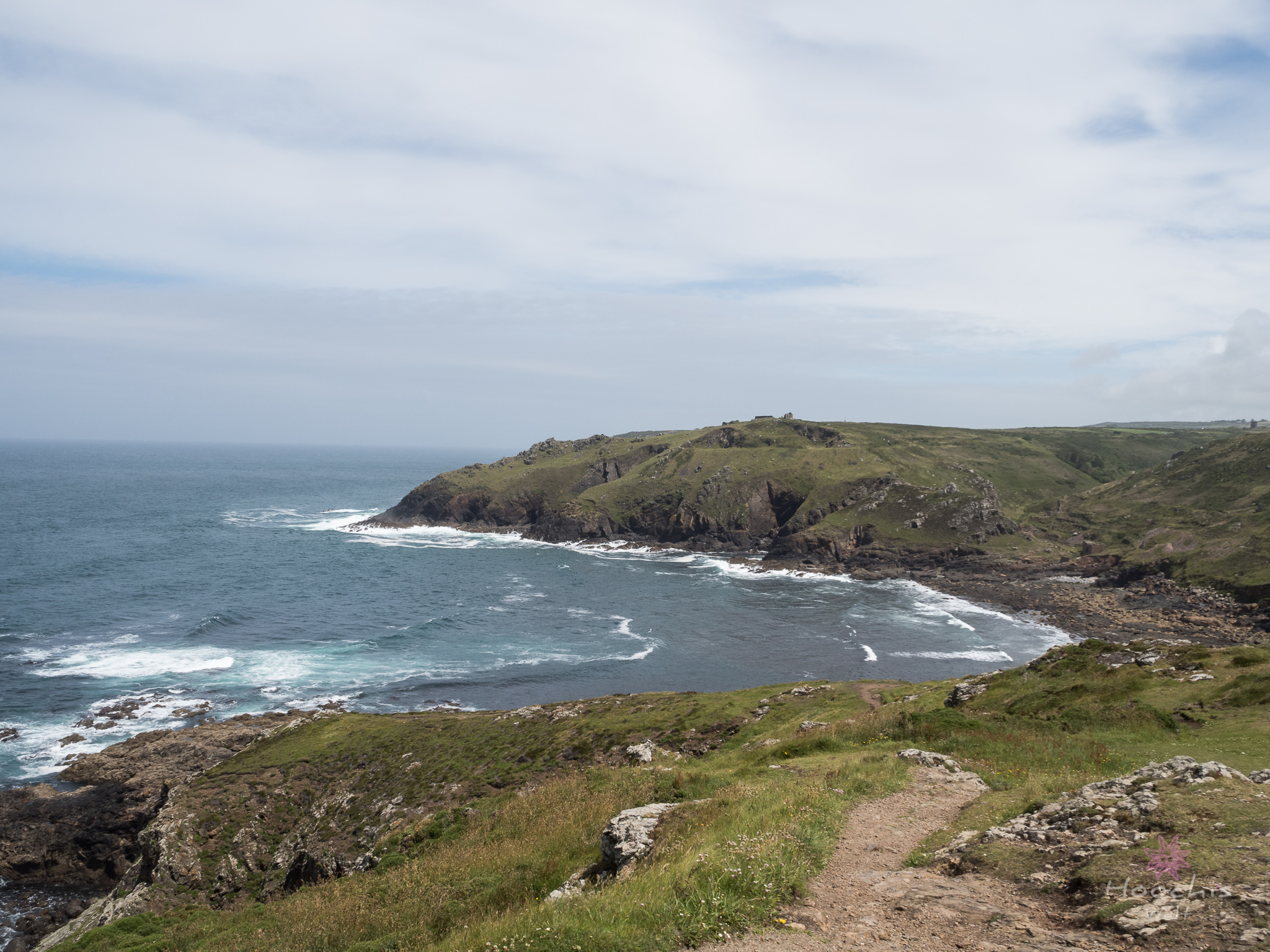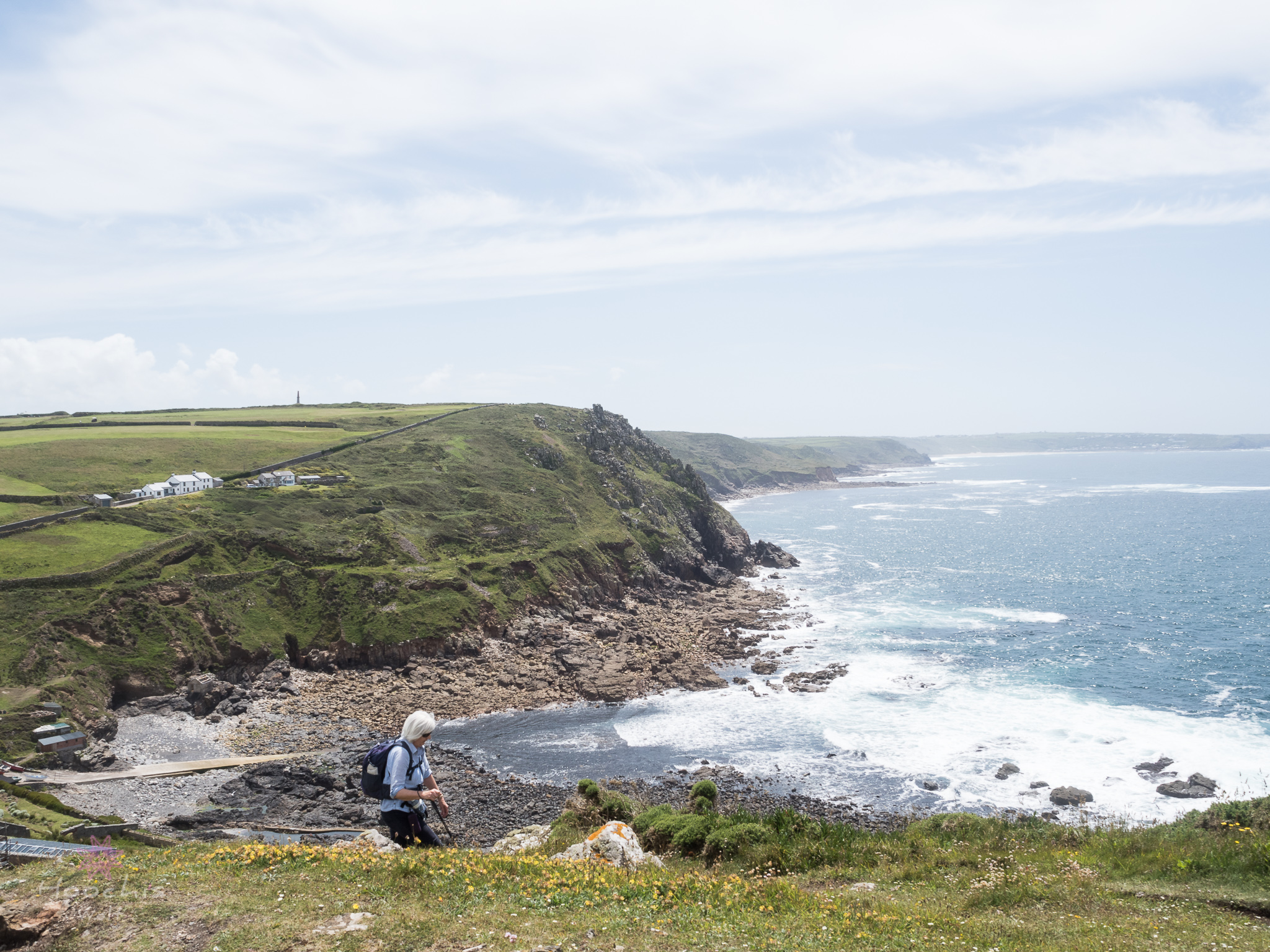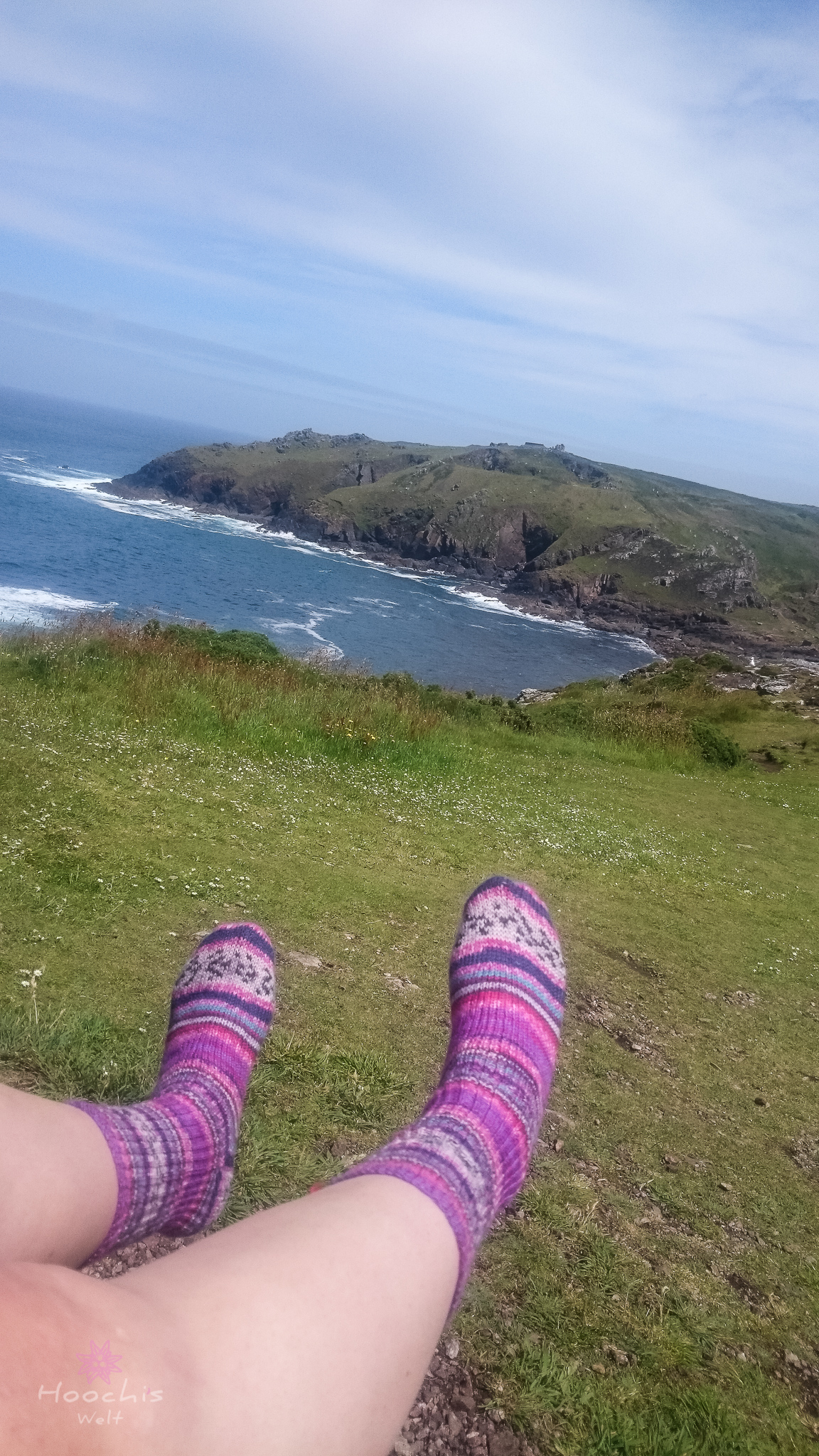 Dort wurden die Wanderschuhe, die Jacke, das Stirnband und der Schal angezogen, der Rucksack auf die Schultern geschnallt, und ab ging die Post. Wir wanderten auf dem South West Coast Path an der Küste entlang zum Cape Cornwall. Es dauerte nicht lange und ich zog meinen Schal aus und musste meine Jacke öffnen. Irgendwann musste ich sogar die Jacke ausziehen und das Stirnband entfernen. Nach ____ Stunden Gehzeit kam ich am Cape Cornwall an und musste auch da noch meine lange Hose zur kurzen Hose umbauen. Dort entstand auch das Foto mit den Wollsocken von Oma. Dieses Foto schickte ich als Gruß an sie. 🙂