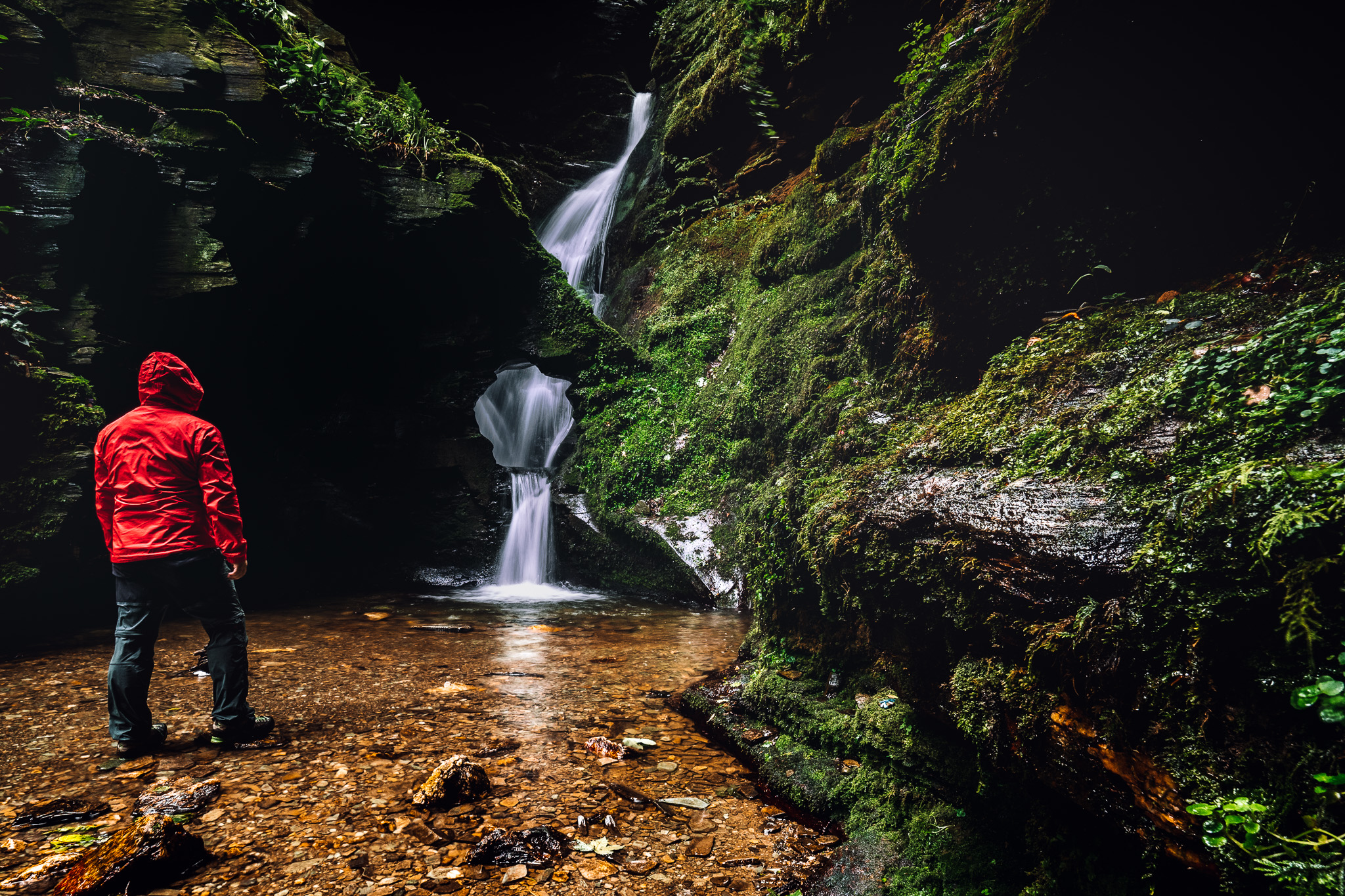 Vom Parkplatz aus ging es durch ein ziemliches Dickicht in Richtung Wasserfall. Zwischendurch kam wirklich subtropisches Feeling auf und man fühlte sich ein wenig wie im Dschungel. Durch die Feuchtigkeit ist einfach alles wunderschön grün und mit unterschiedlichsten Pflanzen verwachsen.