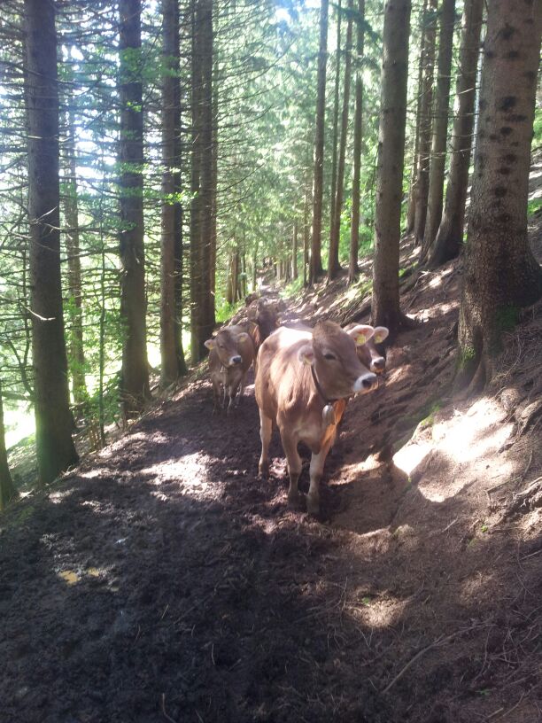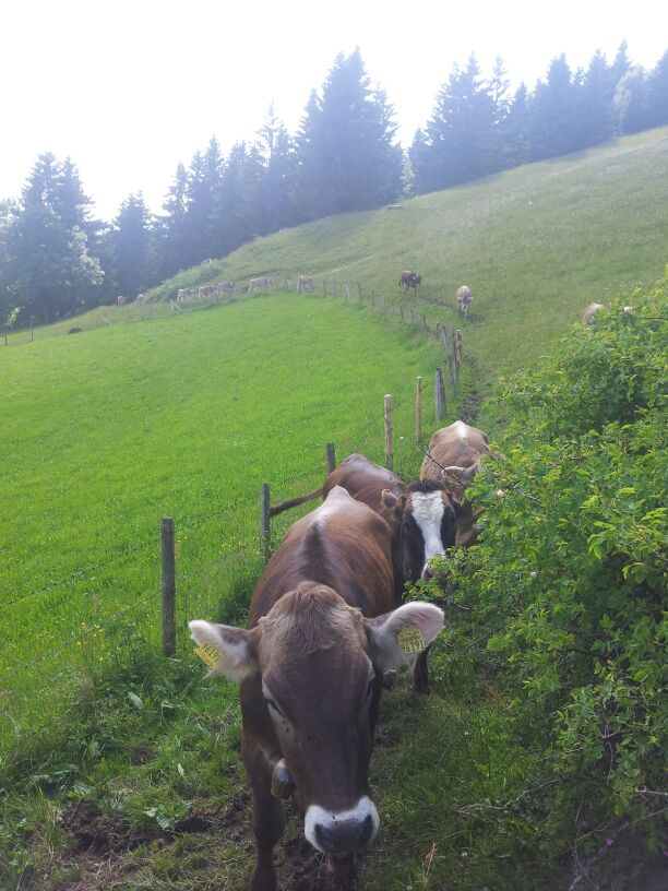 Der Anstieg auf den Grat des Hauchenberg ist nicht wirklich steil und anstregend. Es gibt zwar die ein oder andere knackige Passage, aber grundsätzlich würde ich es als einfache Familientour einstufen. Auf dem Weg zum Gipfelgrat musste ich jedoch mehrmals feindliches Terretorium durchqueren und wurde prompt entdeckt und verfolgt. Sollte man leicht ängstlich gegenüber den Besetzern auf der Weide sein und ein Problem damit haben, wenn eine ganze Horde nur einen Meter hinter einem herläuft, für den ist die Route definitiv nichts. Denn wie soll ich sagen, sie waren schon sehr penetrant angehaucht. Vielleicht hatten sie aber auch nur an meiner neongelben Jacke einen Narren gefressen.