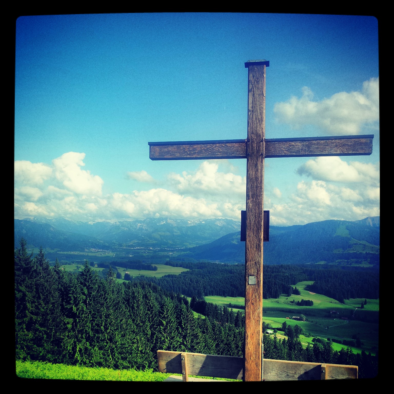Ist man auf dem Grat angekommen, bietet sich einem sofort ein schöner Blick zur gegenüberliegenden Nagelfluhkette und auf die Allgäuer Alpen. Aufgrund des Waldes, bleibt einem aber der Blick auf die andere Seite ins Allgäu und in Richtung des Bodensees erst einmal verwehrt. Der Grat fällt an den Seiten nicht wirklich steil ab und ist wie gesagt schön zu durchlaufen. Kurz vor dem Highlight, dem Alpkönigblick, nimmt man dann noch das Gipfelkreuz des Hauchenberges mit. Ein Muss! Nach 30 Minuten auf dem Grat und einer Gesamtgehzeit von etwa knapp 2 Stunden erreicht man dann schließlich den Aussichtsturm. Von hier starten übrigends auch Gleitschirmflieger, wenn die Bedinungen es zulassen. Vom Turm aus hat man wirklich in allen Richtungen einen wunderbaren Blick. Egal ob ins Ober- oder Westallgäu, in die Alpen oder zum Bodensee. Man erhält einen wirklich schönen Rundumblick.