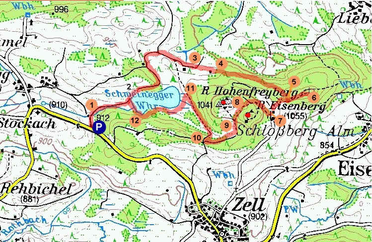 Da uns aber nur die Besichtigungen der Ruinen zu langweilig war, suchte meine Begleitung einen schönen Rundweg aus. Dieser Rundweg führte uns über das Drachenköpfle zu den Burgruinen Eisenberg und Hohenfreyberg.