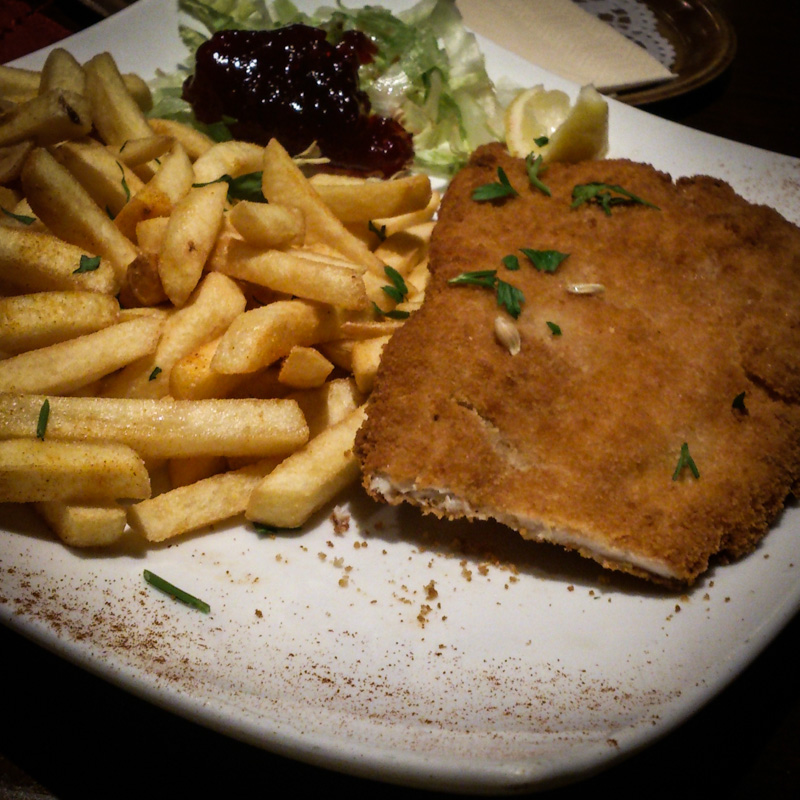 Im „No Problem“ gönnte ich mir ein Bier und Flo gönnte sich einen Cola-Weizen. Flo bestellte sich eine Pizza und ich musste einfach die Pommes probieren. Mit Schnitzel. 🙂