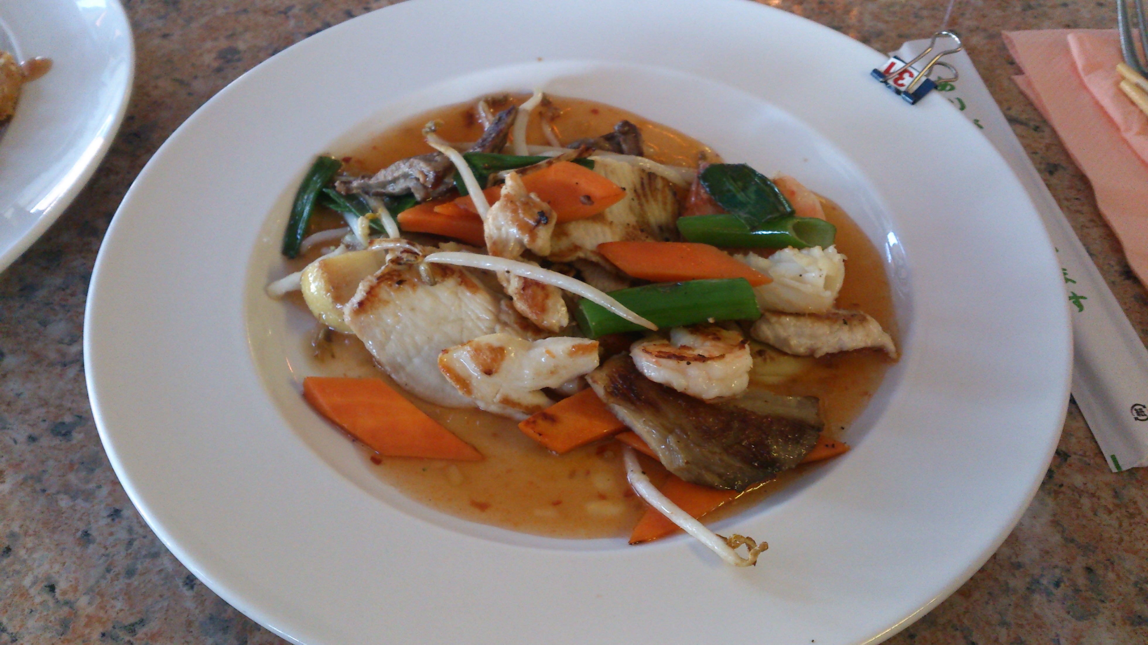 Am meisten freute ich mich aber auf die Nudeln. 🙂 Und das Buffet. Es gab da auch noch ein „roh“ Buffet mit Live-Koch. Man konnte sich Fleisch, Fisch und Gemüse auf einen Teller packen mit einem farbigen Klipser versehen, der die Art der Soße war und gab es dem Koch. Dieser Koch brutzelte einem dann die Ausgesuchten Lebensmittel und man bekam es frisch an den Tisch geliefert.