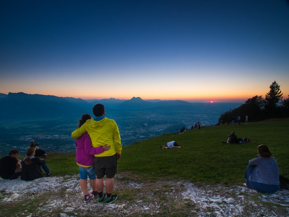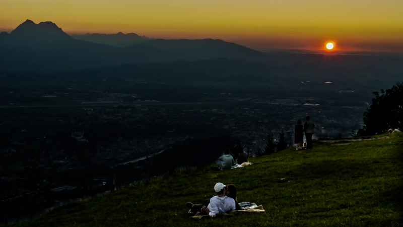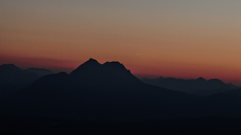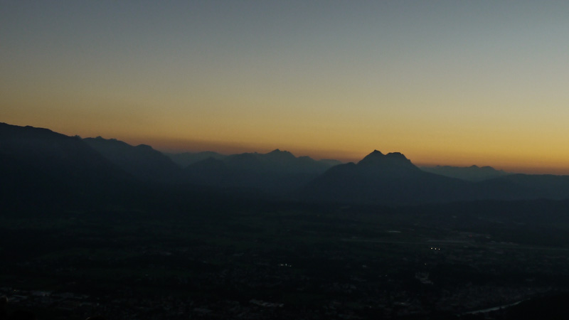 Spontan und kurz entschlossen fuhren wir dann doch nochmal auf den Gaisberg. Zum Sonnenuntergang. Es war eine Rucki-Zucki Aufbauaktion der Fotoausrüstung, denn die Sonne wurde blutrot und verschwand bereits. Es reichte aber aus, um mir kurz zu erklären, wie ich tolle Sonnenuntergangfotos hinbekomme. Etwas üben muss ich natürlich noch, aber ich möchte hier trotzdem ein paar einfügen. 😉