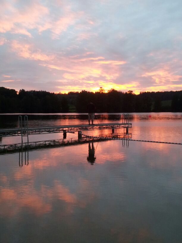 Plötzlich sahen wir die Tannenspitzen golden leuchten und ich wurde gepackt und wir gingen noch an den Leitgeringer See und genossen den Sonnenuntergang.
