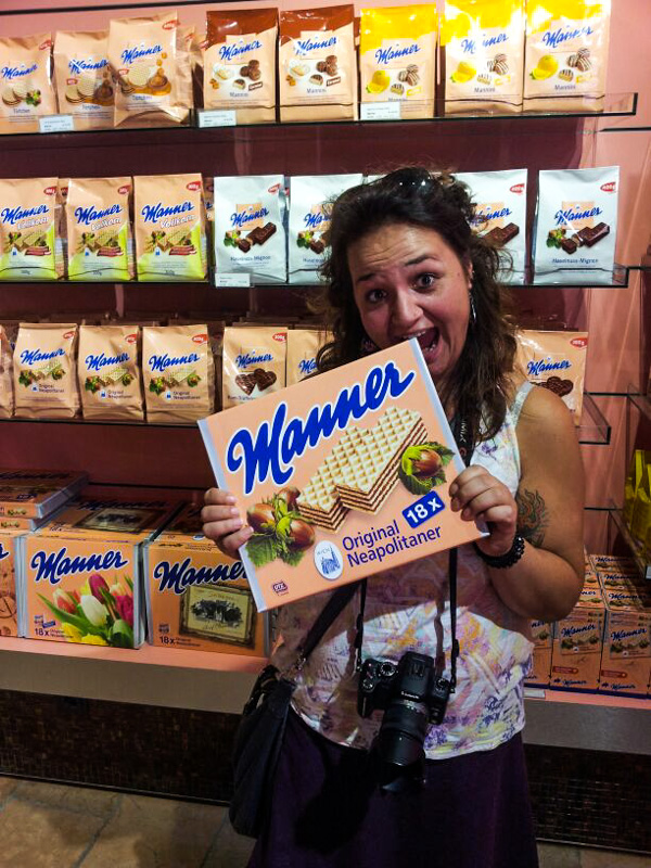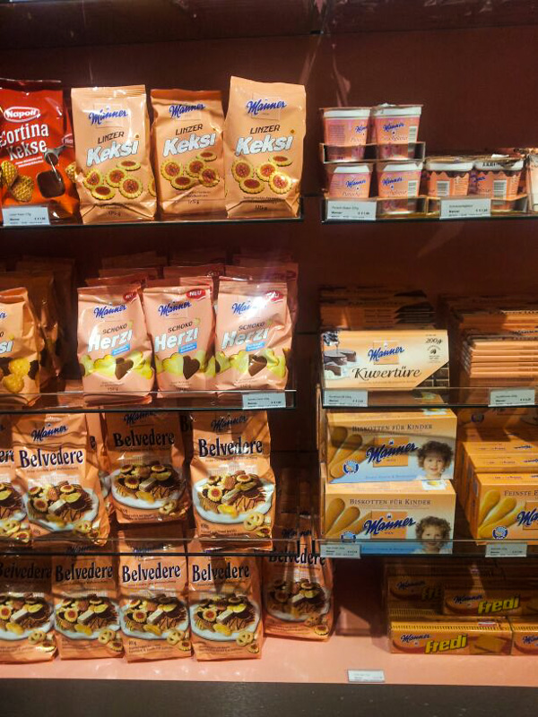 Nachdem ich den Brunnen, der vor dem Salzburger Dom steht betrachtete, sah ich plötzlich den Laden meiner Träume: MANNER. Da musste ich hin. Ich blieb sogar mitten auf der Straße stehen, um ein Foto zu machen. Sonst würde das mir ja keiner glauben. Im Laden gab es wirklich alles!! Tassen, Waffeln, Schokoglasur, Kleidungsstücke, Kekse, Kugelschreiber, Feuerzeug und und und…