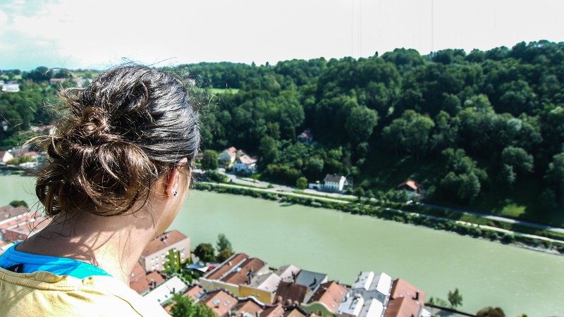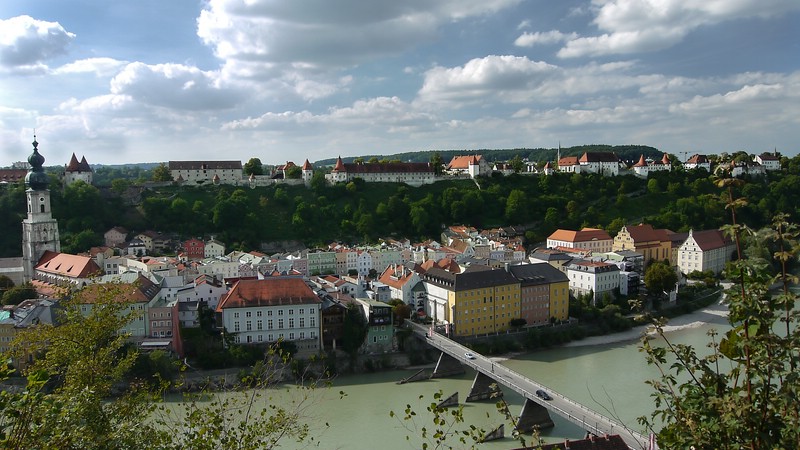 Wir zogen weiter zum Salzach-Inn-Blick. Dem Zusammenfluss von Salzach und Inn. Das sind zwei Flüsse. Für die, die nicht wissen was das denn schon wieder sein soll. Das war ein Tipp von Helmut. Wir fanden ihn nicht ganz so spektakulär, da es langsam trüb wurde. Aber wir genossen auch dort noch eine Weile die Aussicht, bevor wir zurück nach Burghausen fuhren.