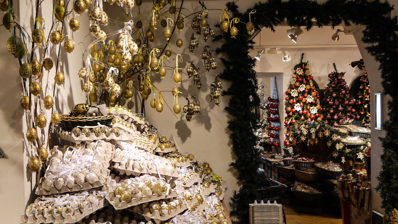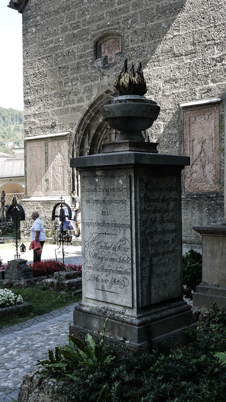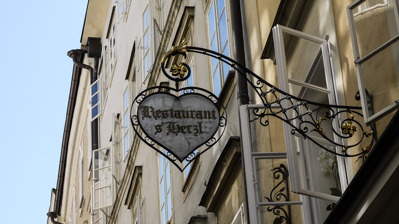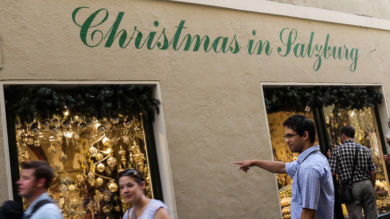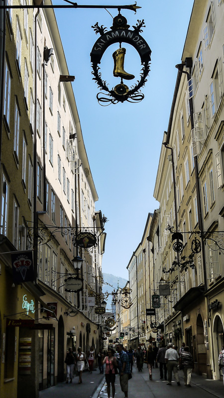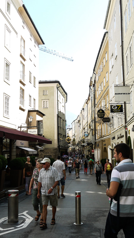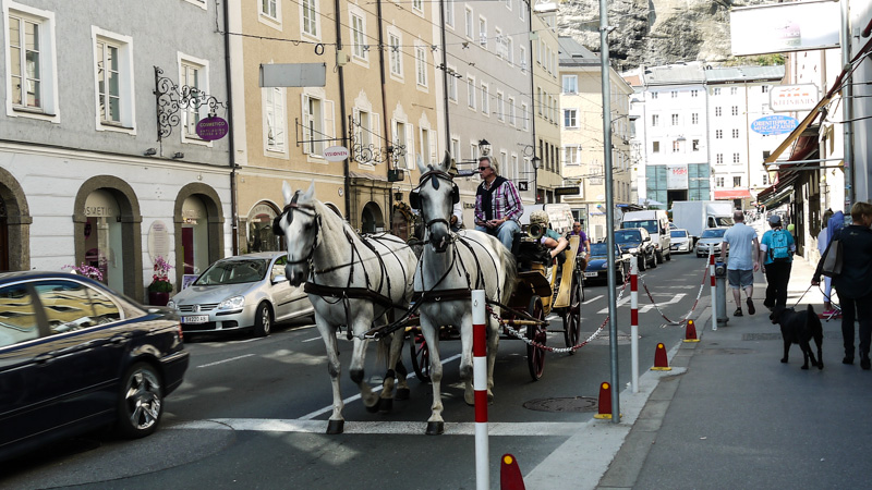Anschließend ging es an Mozart’s Wohnhaus vorbei in die Altstadt. Der Weg führte über den Makartsteg, der inzwischen voll ist mit Schlössern von Liebenden. In der Griesgasse kam mir die erste Pferdekutsche entgegen und dann ging es rein in’s Getümmel der Getreidegasse, die heute noch geschmiedete Ladenschilder vorweist. Wir kamen an Mozart’s Geburtshaus, Gucci, Thomas Sabo, Christmas in Salzburg (DER Laden, der einen verrückt macht. Soweit man es noch nicht ist. Weihnachten und Ostern in einem Laden. das ganze Jahr!) vorbei, die Judengasse entlang zum Mozartplatz auf der eine große Statue von Mozart steht.