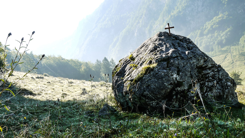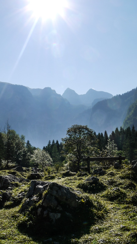 Auf Salet angekommen wurden zuerst einmal Nebelfotos gemacht. Sehr mystisch. Ich konnte es aber nicht mehr abwarten, bis der Watzmann endlich aus dem Nebel kam. Den wollte ich unbedingt sehen. Ich durfte mir als Kind immer die LP meiner Eltern anhören „Der Watzmann ruft“ und deshalb war ich gespannt wie ein Flitzebogen diesen Berg mit seinen Kindern mal gegenüber zu stehen.
