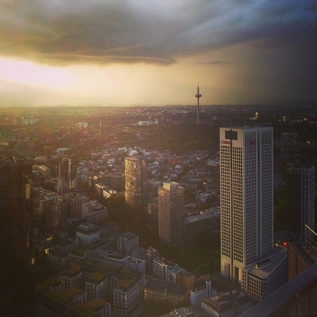Holt nun Eure Taschentücher raus, nehmt mich in den Arm und spendet mir Trost. Mit einer Trä… Moment *pressen*… Mit einer Träne, die mir an meinem sanften Bäckchen entlang nach unten kullert, schreibe ich nun diesen Absatz. Im gewohnten Tempo ging es nämlich nun auf die Spitze des Maintowers. Bei leichtem Regen und Wind versteht sich. Es war also alles angerichtet, für einen melodramatischen Augenblick. Abseits dessen, zauberte das Wetter dadurch ein traumhaftes und zugleich sureales Szenario über die Dächer von Frankfurt.