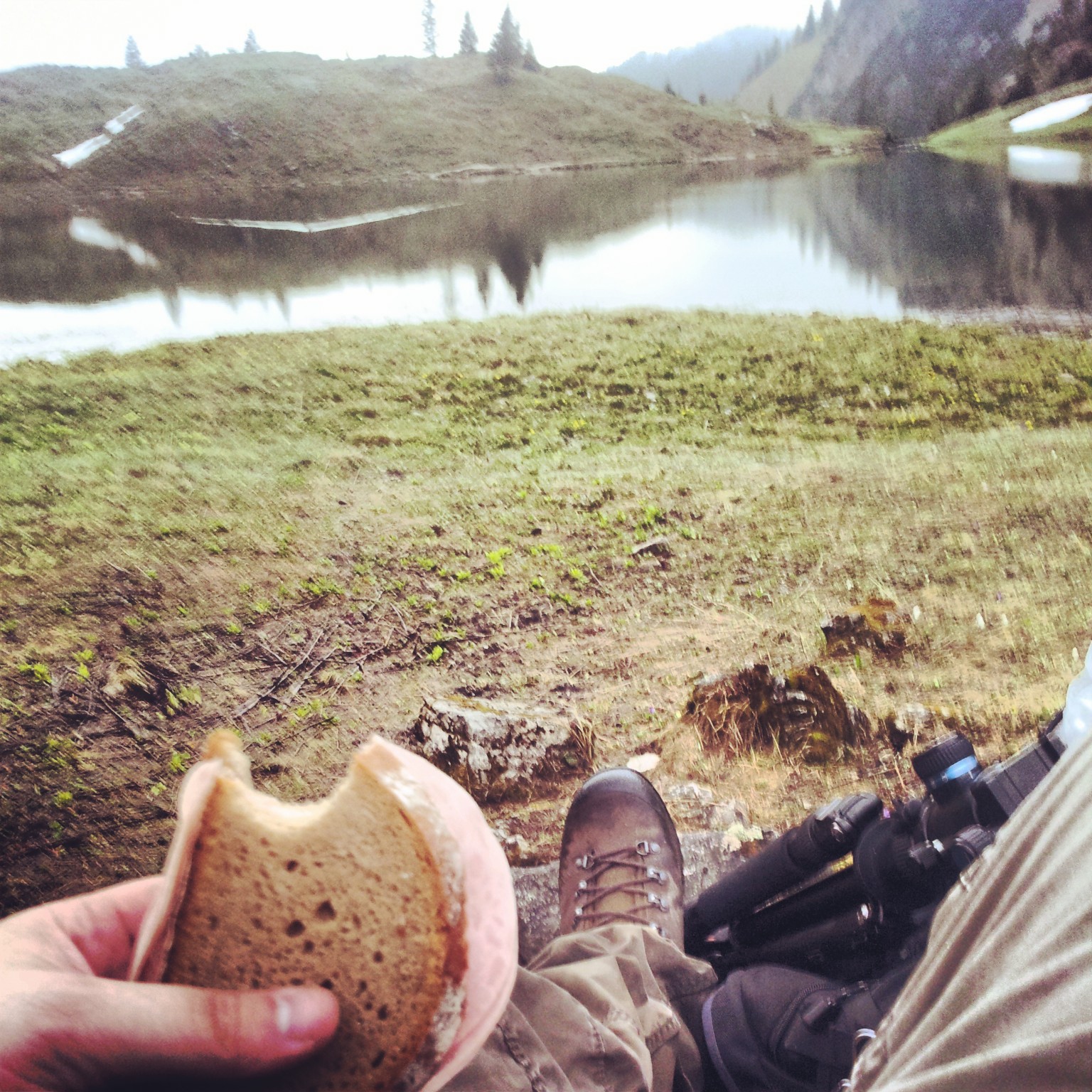 Ich hatte zum Glück trockene Klamotten dabei, zog mich also erstmal um und suchte mir anschließend ein freies Plätzle für das Frühstück. Es war mittlerweile grau in grau geworden und ich zweifelte schon langsam daran, ob ich überhaupt ein Foto hier zustande bringen würde.