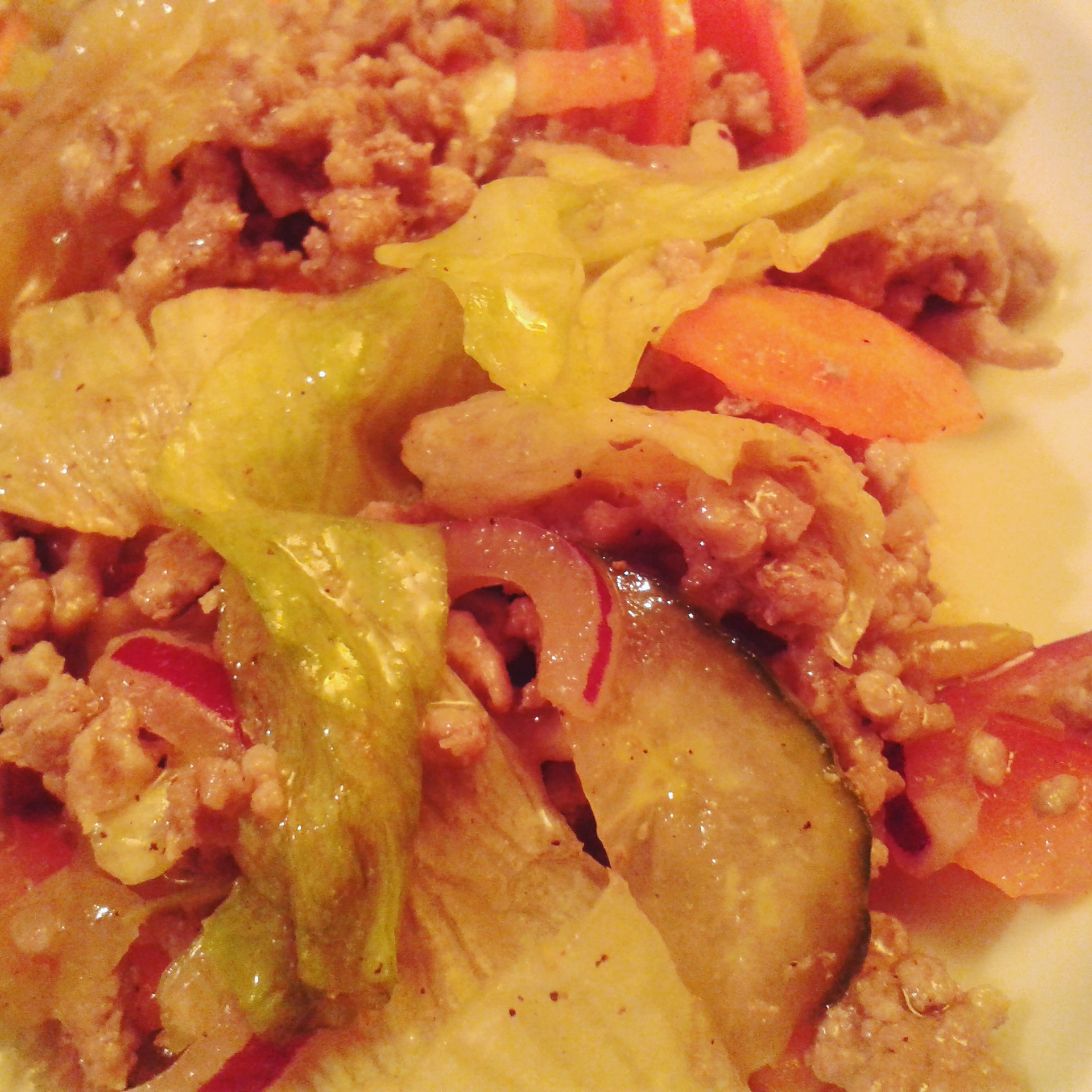 Den Salat in eine Schüssel geben, das Hackfleisch darauf verteilen und mit der Dressing bedecken.