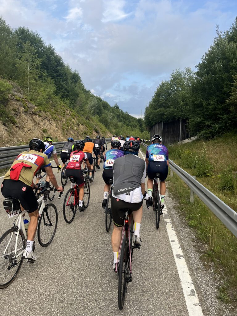 Ich fuhr wie beim Riedbergpass wieder mein Stiefel, alles war gut. Meine Demotivation war quasi verflogen. Ich war wieder voll da! Keine Gruppen mehr, nur noch vereinzelte Fahrer die sich hoch kämpften. Alle fochten Ihren persönlichen Kampf dabei aus. Keiner war extrem schnell oder extrem langsam. Es war ein Geben und Nehmen zwischen den Teilnehmern. Jeder für Sich. Ab und an mal ein kurzes „puuuuh, zieht sich schon“ untereinander, dann wieder Fokus. Jemand wollte meine Socken haben „Ich bin der Akku“ steht da drauf. Ich wollte deren Socken haben, da waren Pizzastücke drauf. Galgenhumor inmitten der Anstrengung.