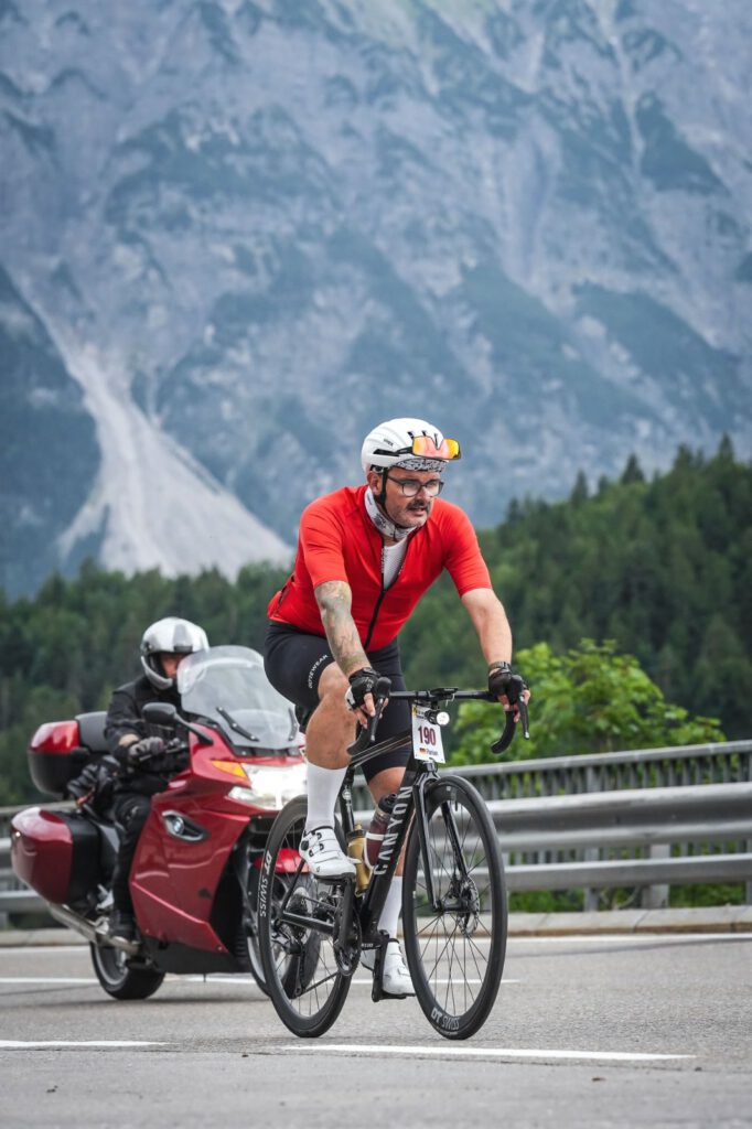 Die anschließenden 40 KM durch das Lechtal war ich… wie kanns anders ein… allein. Kurios: Ich sah nicht Mal mehr irgendjemanden. Vor mir keinen, hinter mir keinen. Es war zu dem Zeitpunkt ein einsames Rennen. Ich mit mir. Kein Anderer in Sicht. Ja, es ging „Bergab„. Permanent. Ich hatte aber bereits über 160 KM und 2 Alpenpässe in den Beinen. Zudem war schon Nachmittag und ein leichter Gegenwind wehte mir ins Gesicht. Der Tag war also schon lang und Anstrengend bis dato. Die Müdigkeit kickte so langsam und die Watt konnte ich nicht mehr hoch halten. Ich spulte stumpf KM um KM runter. Kann mich kaum erinnern was einem Kilometer davor war. Funktionierte halt einfach.