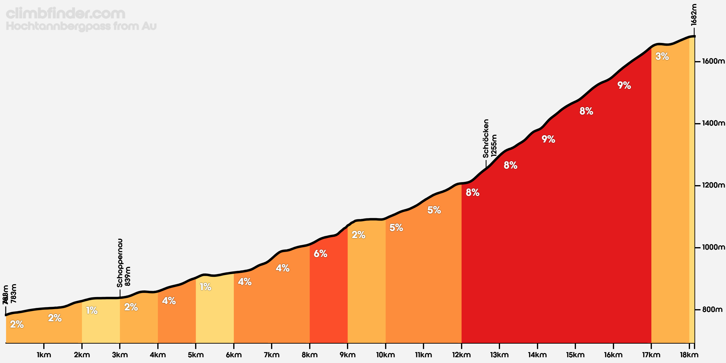Das Profil das Ihr hier seht ist im Endeffekt die Erkenntnis, dass es bereits ab der Abbiegung in den Bregenzer Wald nur noch Bergauf ging. Der Checkpoint ist Au und kurz danach geht es in den Hochtannbergpass Anstieg. Am Ende also 45KM bergauf, 12KM davon Passstraße.