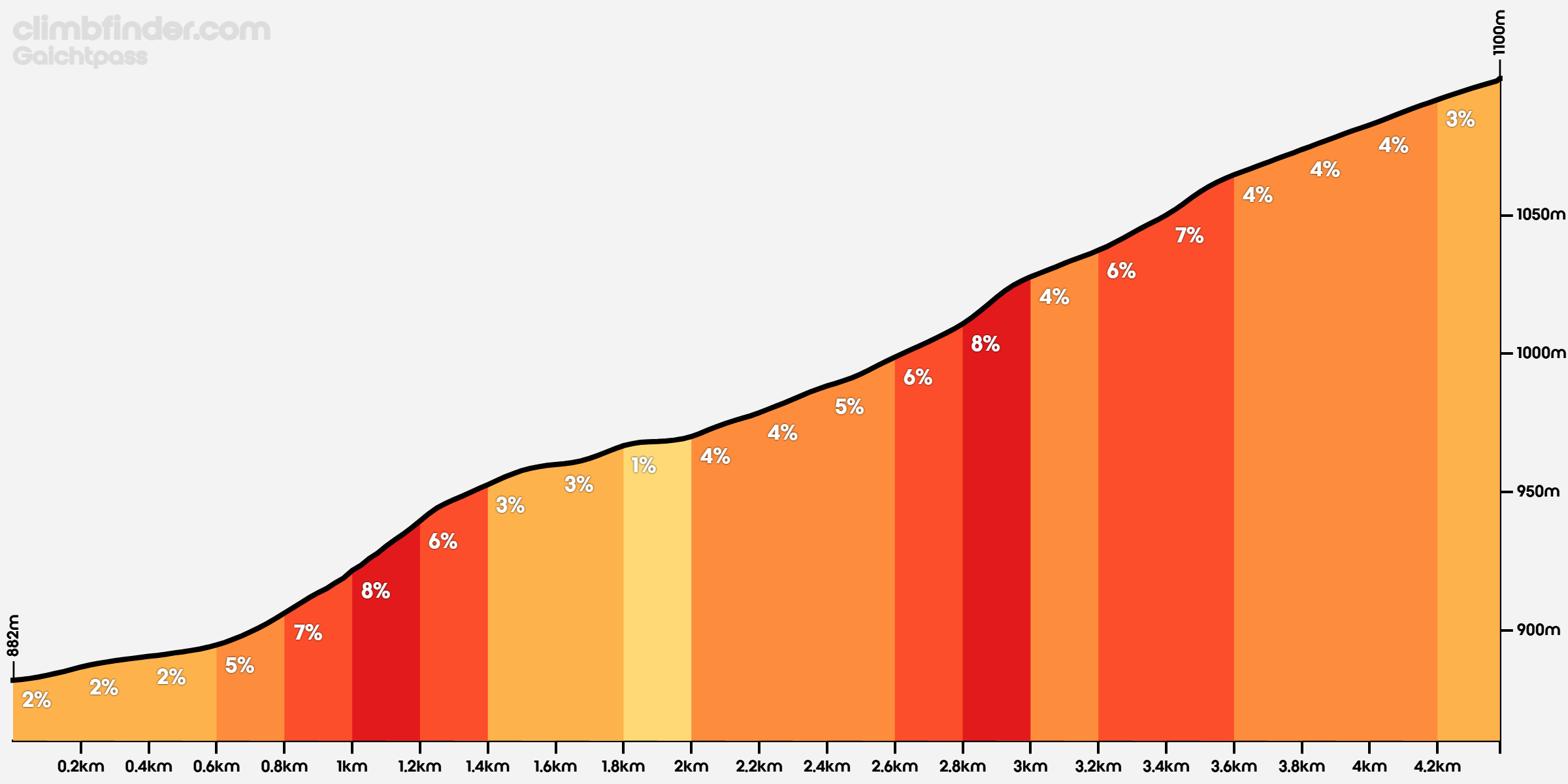 Der Gaichtpass selbst ist an sich nicht mehr so wild. Allgemein sieht die Topologie hier schwieriger aus als sie sich tatsächlich anfühlt. Es gibt 2 kurze Rampen die ein wenig drücken, aber ansonsten fuhr sich dieser gut weg. Evtl. lag es auch daran, dass ich das Ziel schon vor Augen hatte.