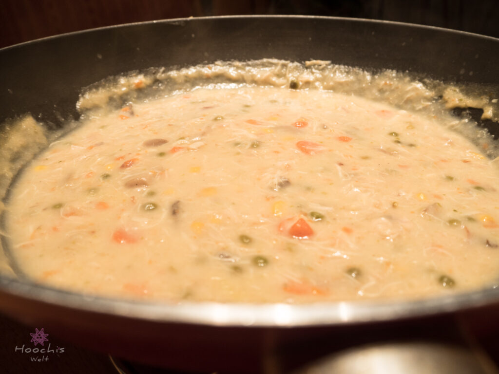 In der Zwischenzeit Karotten und Erbsen abbrausen, Champignons und Spargel schneiden. Nach der Garzeit das Fleisch herausnehmen und in mundgerechte Stücke zupfen. Die Butter im Topf schmelzen und das Mehl dazugeben. Den Topf vom Herd nehmen und die noch heiße Brühe unter Rühren mit dem Schneebesen dazugeben, dann unter weiterem Rühren zum Kochen bringen. Erbsen, Karotten, Champignons, Spargel und Hühnerfleisch dazugeben. Mit Muskat, Pfeffer und Salz abschmecken.