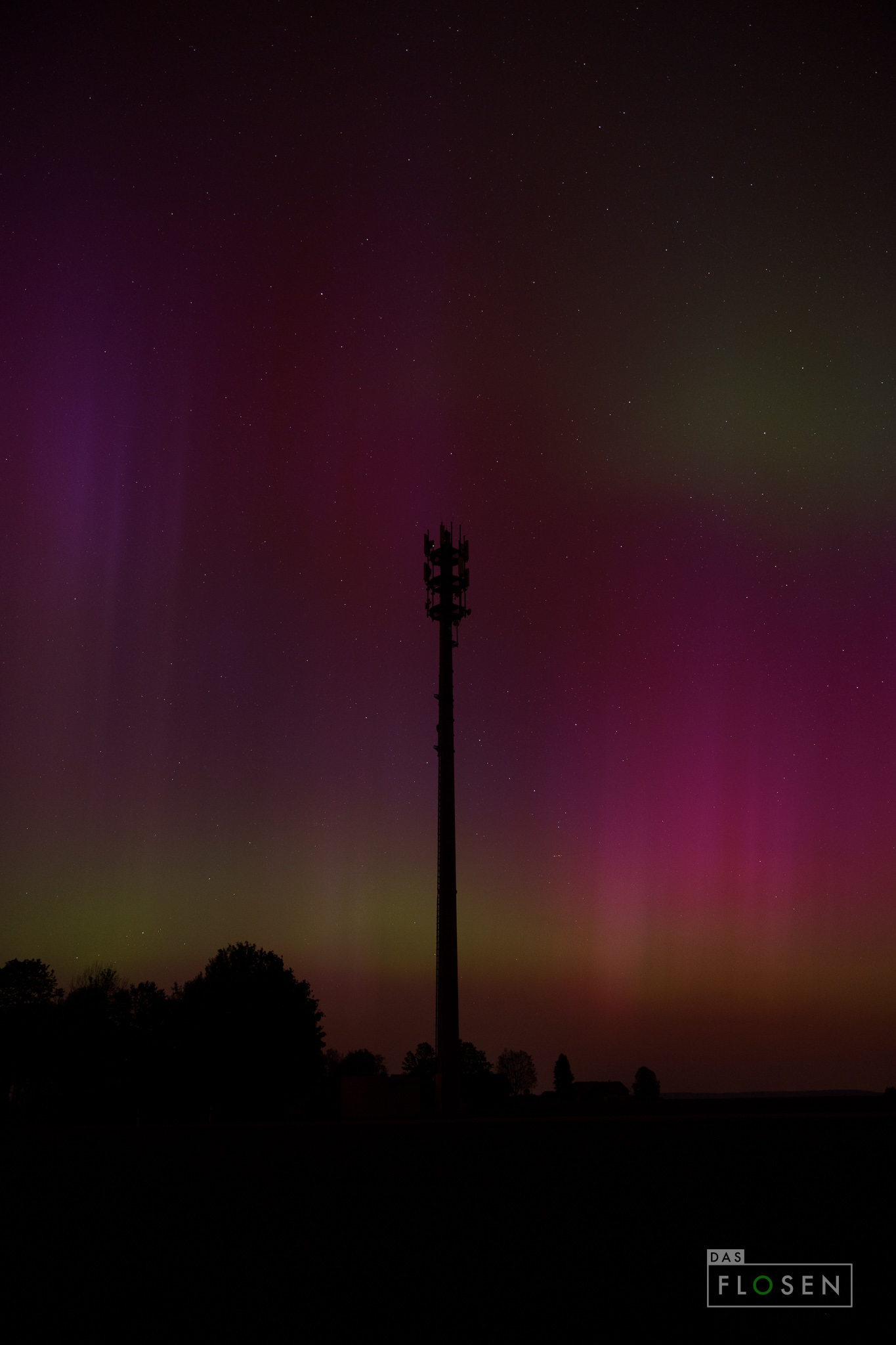 Was mich wiederum störte war mein Beobachtungsstandort. Nicht weil dort noch andere Personen standen und immer mehr dazu kamen, sondern Ihr erinnert Euch… Umspannwerk. Da waren also überall diese Stromkabel und Hochspannungsleitungen im Bild. Für viele ein guter Spot, aber mich triggert sowas einfach. Wir haben „da Oben“ aber so einen Funkmasten, also schoss ich kurz ein Bild in Richtung eines Funkmastens um auch die Lichter am Himmel ein wenig einschätzen zu können. Bringt mir schließlich auch nichts, wenn jetzt einen besseres Motiv habe, aber eher bescheidene Himmelsaktivitäten.
