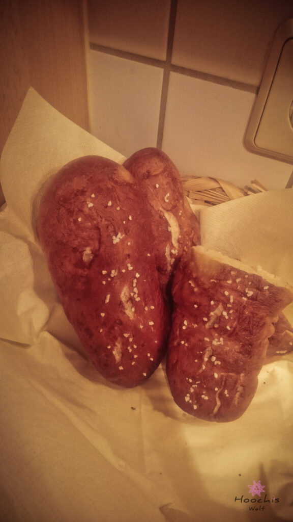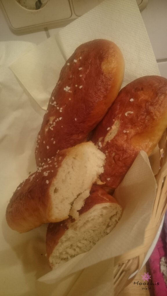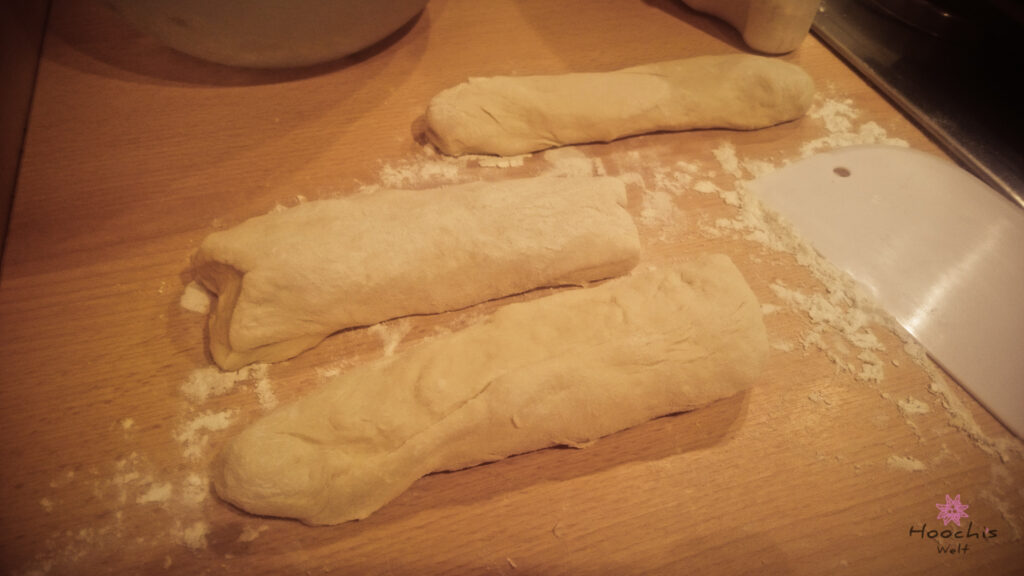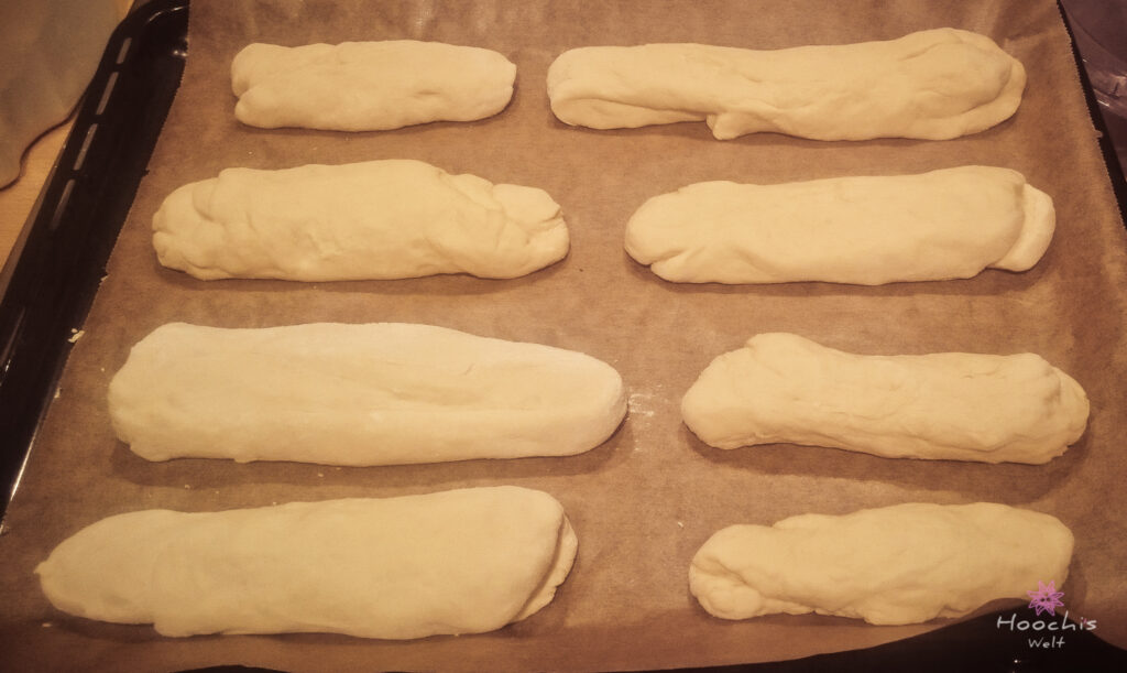 Den Teig auf der bemehlten Arbeitsfläche nochmals gut durchkneten und in Portionen aufteilen. Ich habe mich für große, sehr große Laugenstangen entschieden. 🙂 Die Teiglinge auf das bemehlte Backblech geben und mit einem Tuch bedeckt noch einmal 15 Minuten an einem kalten Ort ruhen lassen.