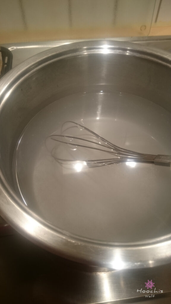 Das Natron in einem Topf mit 2 Liter Wasser aufkochen und anschließend bis knapp unter dem Siedepunkt abkühlen lassen. Nach und nach die Teiglinge einlegen und sobald sie an die Oberfläche kommen aus dem Wasser nehmen. Auf das bemehlte Backblech legen und mit grobem Salz bestreuen.