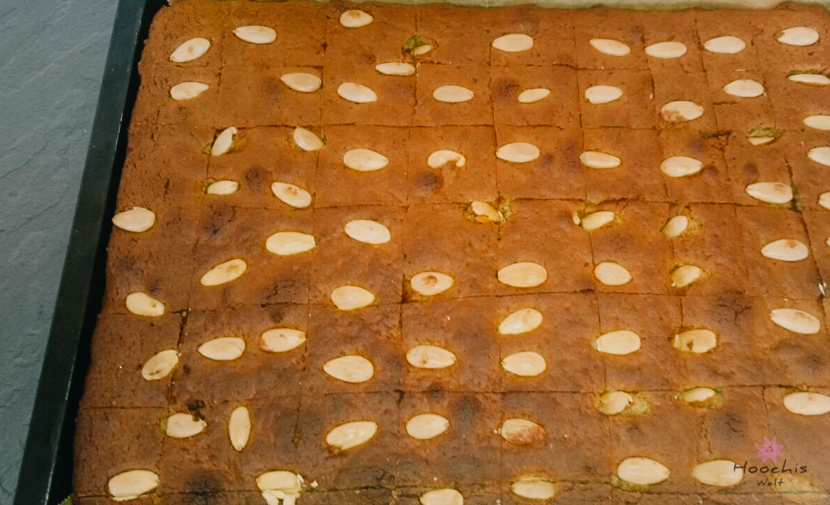 Den Zucker und die Eier schaumig schlagen. Danach den Honig unterrühren. Mehl, Backpulver, Haselnüsse und Lebkuchengewürz dazu geben und verrühren. Das Backblech einfetten und den Teig darauf verteilen. Mit den Mandeln verzieren.