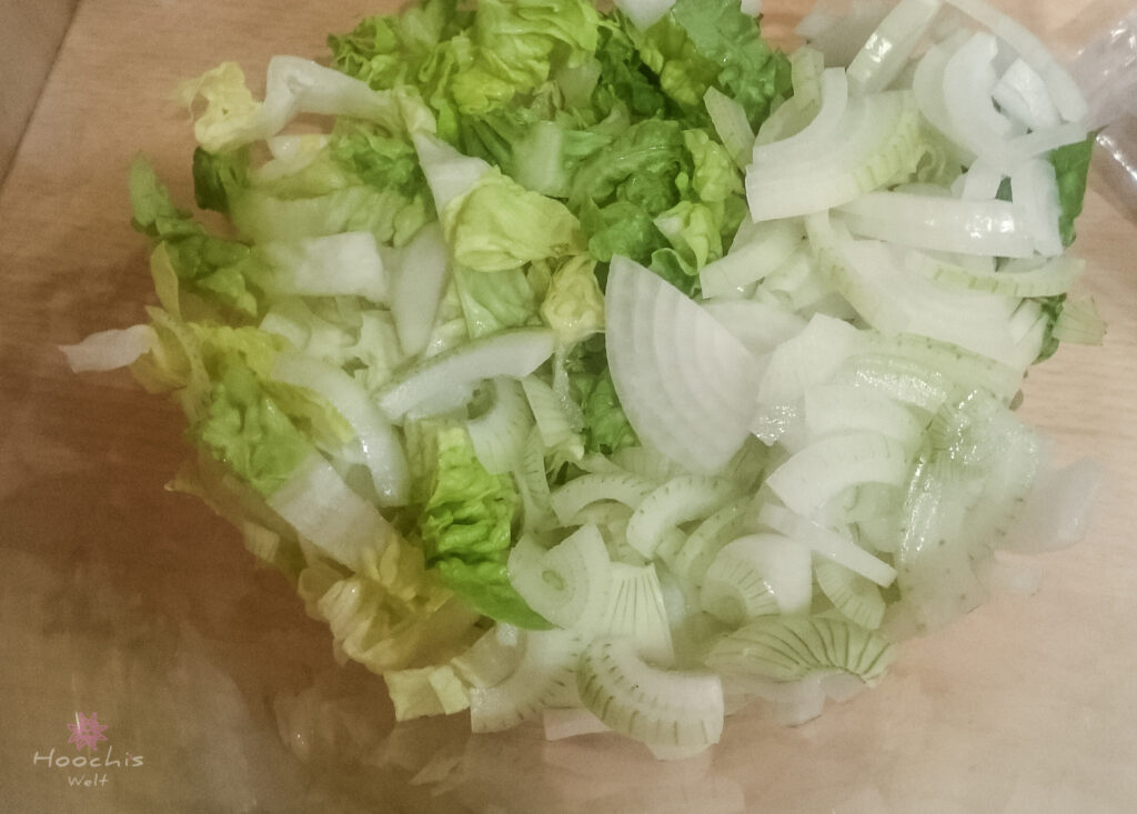 Die Salatherzen halbieren, den Strunk entfernen und in schmale Streifen schneiden. Die rote Zwiebel schälen und klein schneiden.