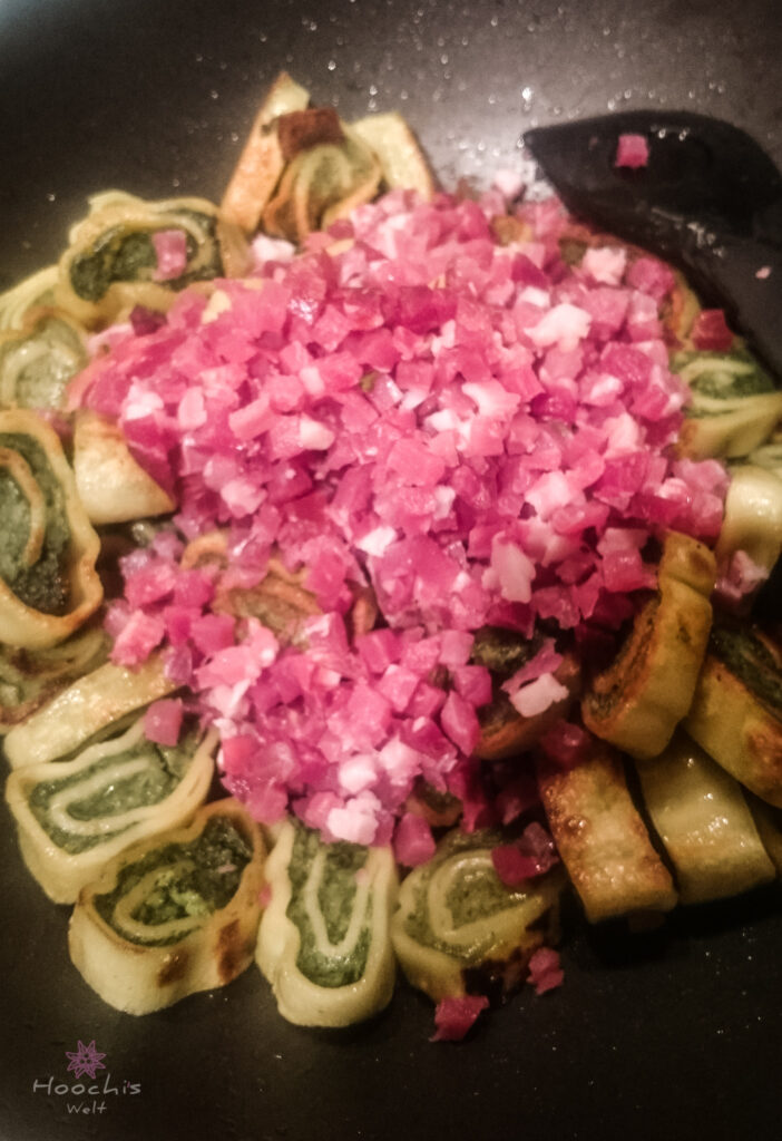Die Maultaschen nach Packungsanweisung garen, beiseite stellen und im Sud etwas abkühlen lassen. Nach belieben können die Maultaschenscheiben auch angebraten werden.