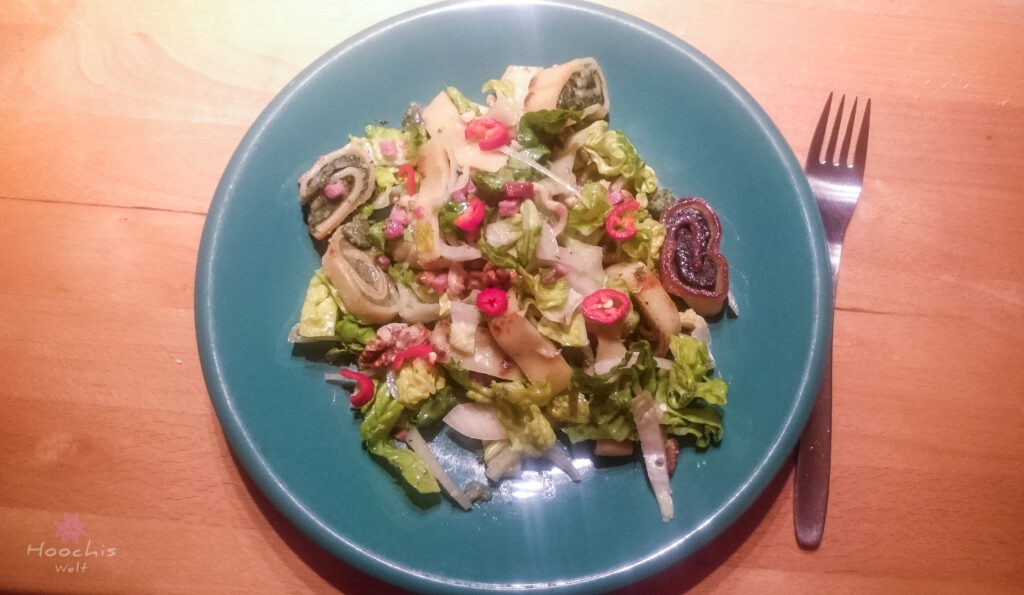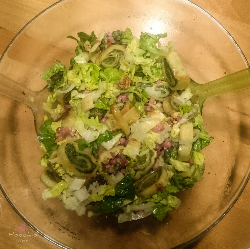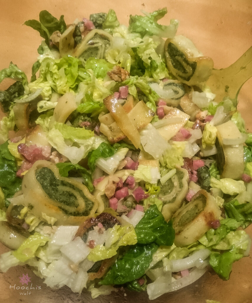 Aus Essig, Öl, Senf, Honig, Salz und Pfeffer ein Dressing herstellen. Salat, gehackte Walnüsse, Zwiebeln und den krossen Speck in einer großen Schüssel vermengen. Die noch lauwarmen Maultaschen in schmale Streifen schneiden, auf dem Salat anrichten und das Dressing darüber träufeln.