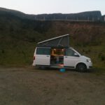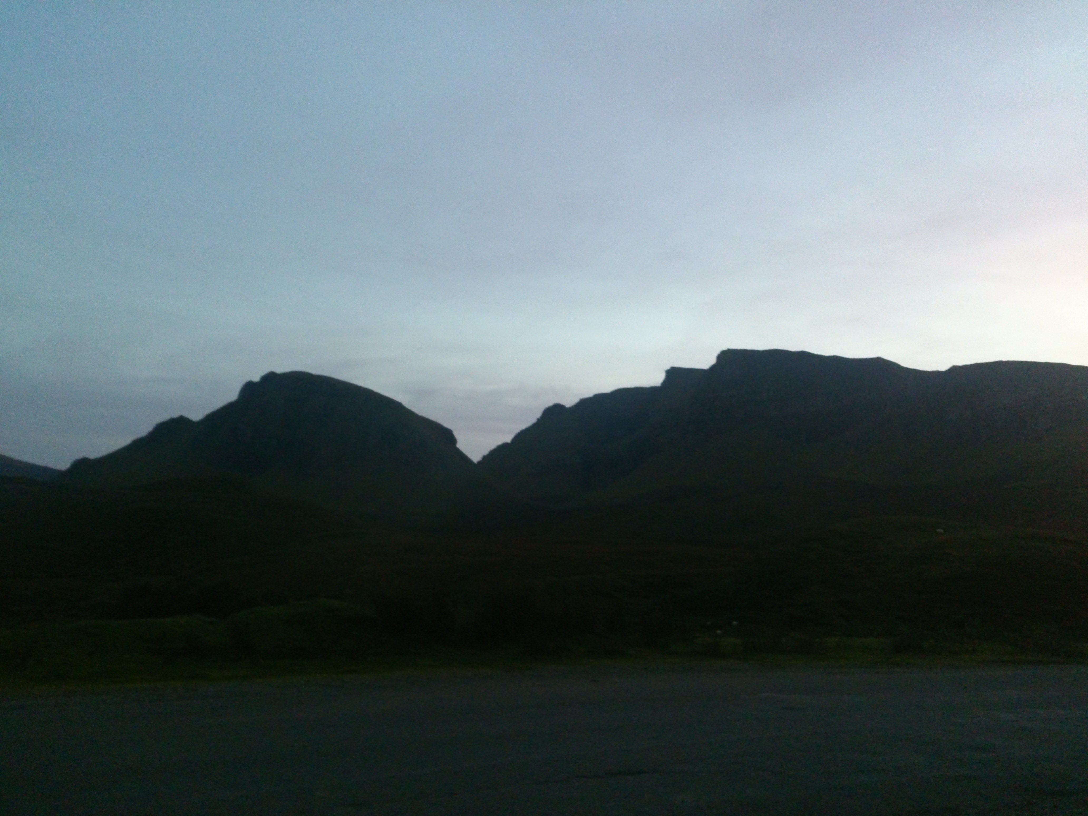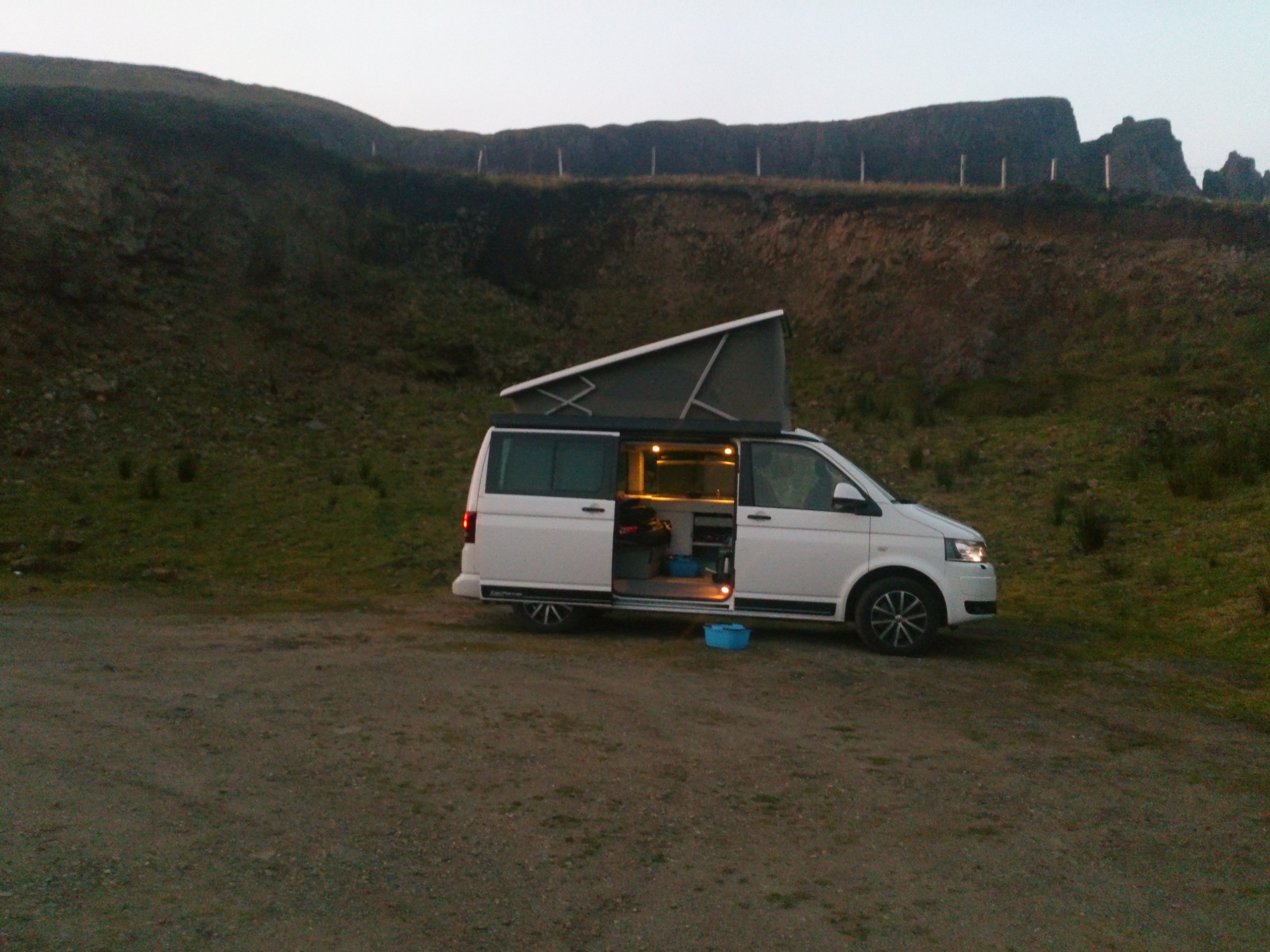 Das letzte Ziel für diesen Tag war Quiraing. Auf dem Aussichtspunkt warteten wir gespannt auf den Sonnenuntergang. Wir warteten und warteten… Der Wind pfeifte um die Ohren. Fotografen und Wanderer kamen auf dem schmalen Feldweg uns entgegen. Unter anderem zwei Jungs aus der Heimat. Irgendwann gingen wir zurück zu Bruno und fuhren die Paßstrasse hinuter in eine Ausbuchtung, die unser Lager für diesen Abend sein sollte.