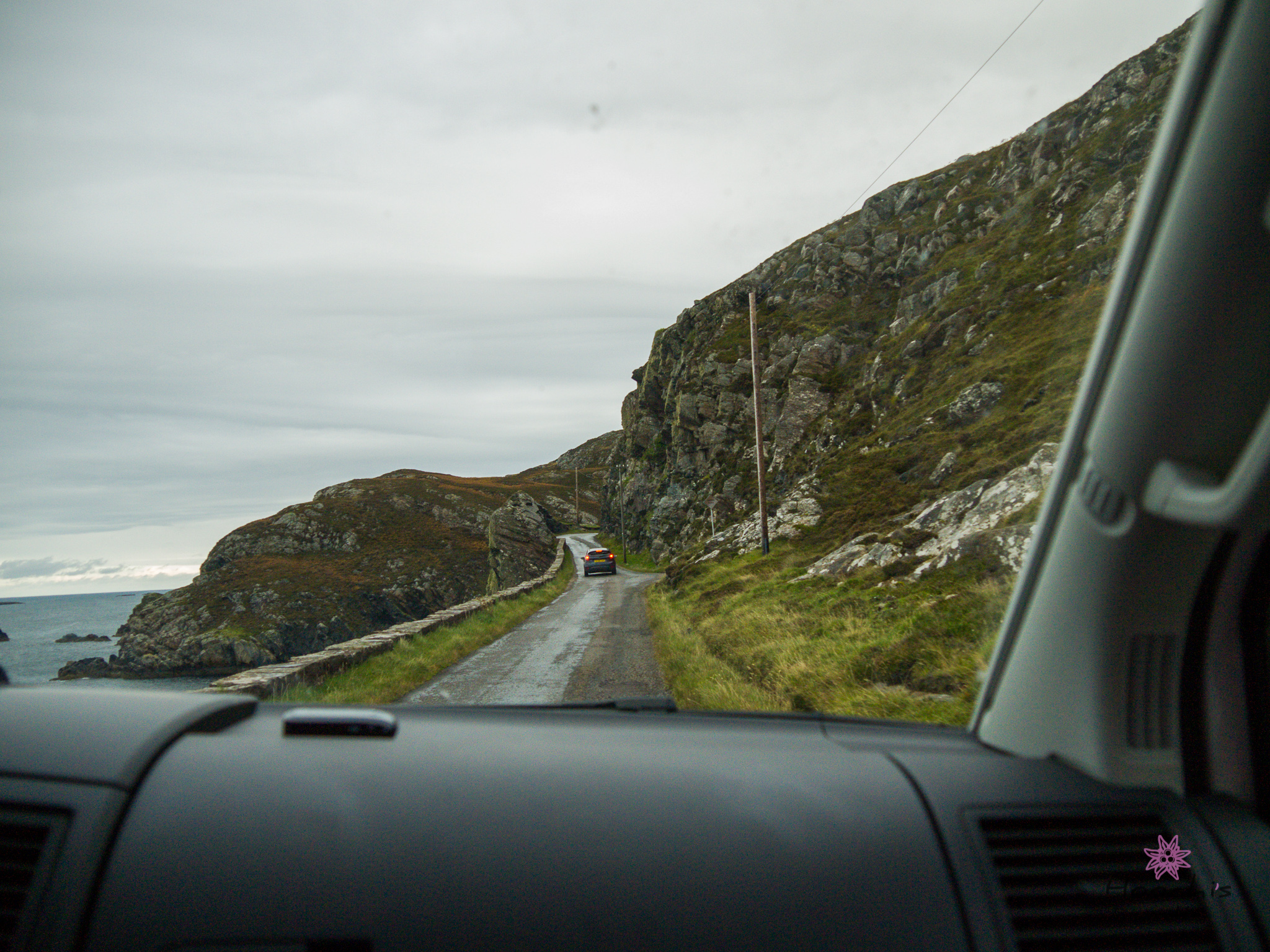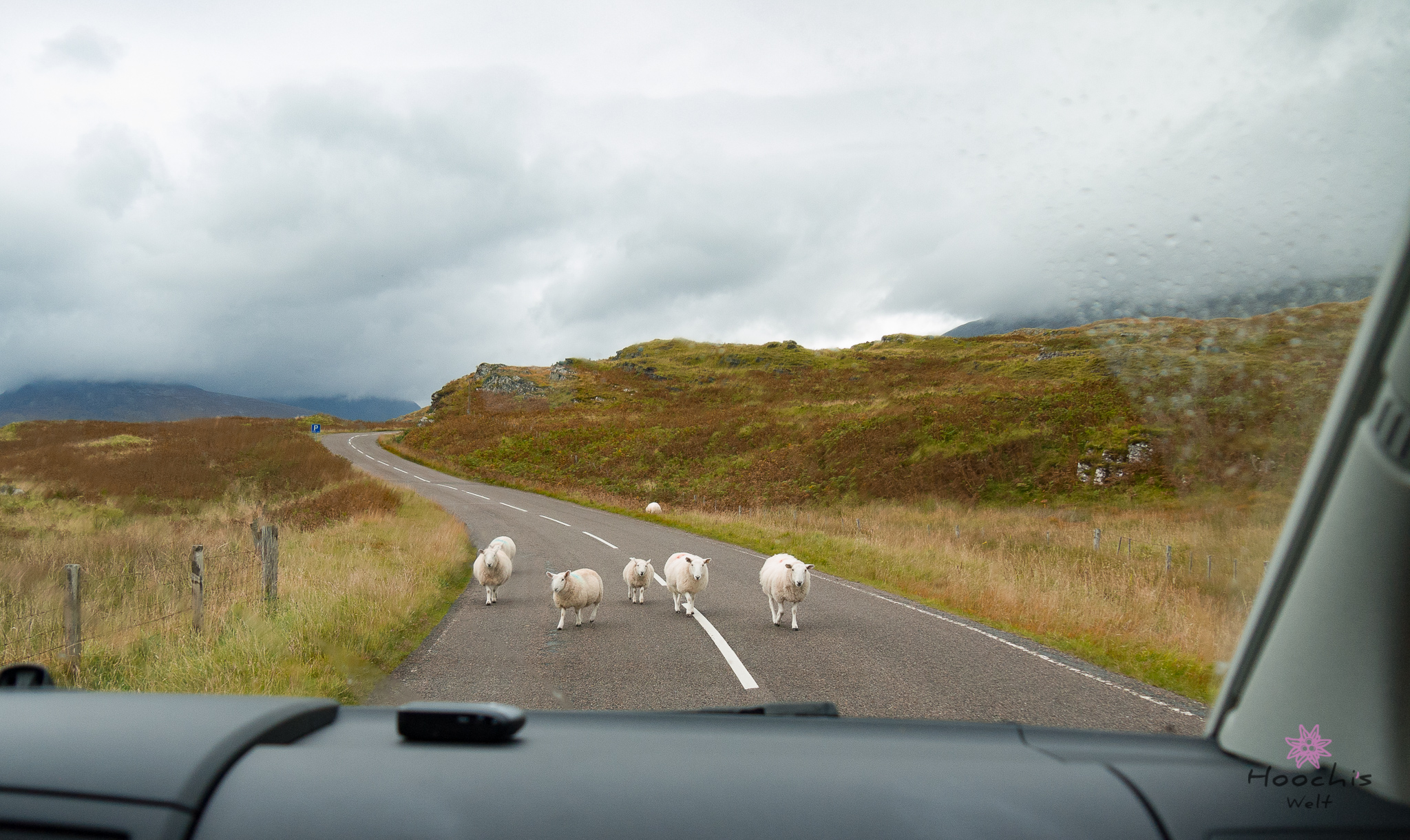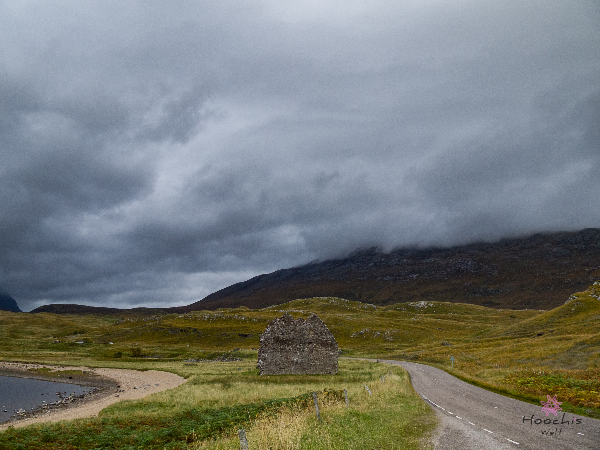 Es begann zu regnen und wir setzten unsere Fahrt fort in Richtung Lochinver. Wir fuhren die Single Track Road, die über Clashness und Drumbeg nach Ullapool führte. An der Küste entlang brachte uns Bruno nach Scourie, wo er dann mit teurem schottischen Diesel befüllt wurde.