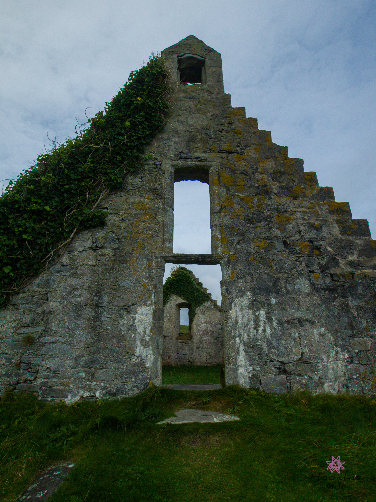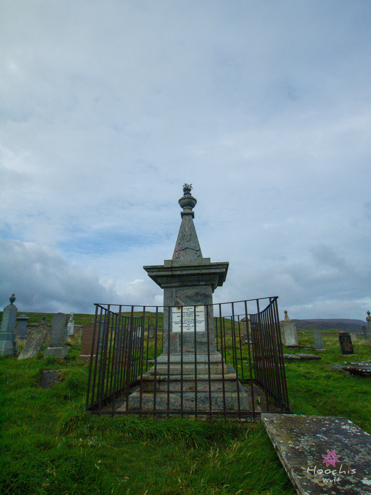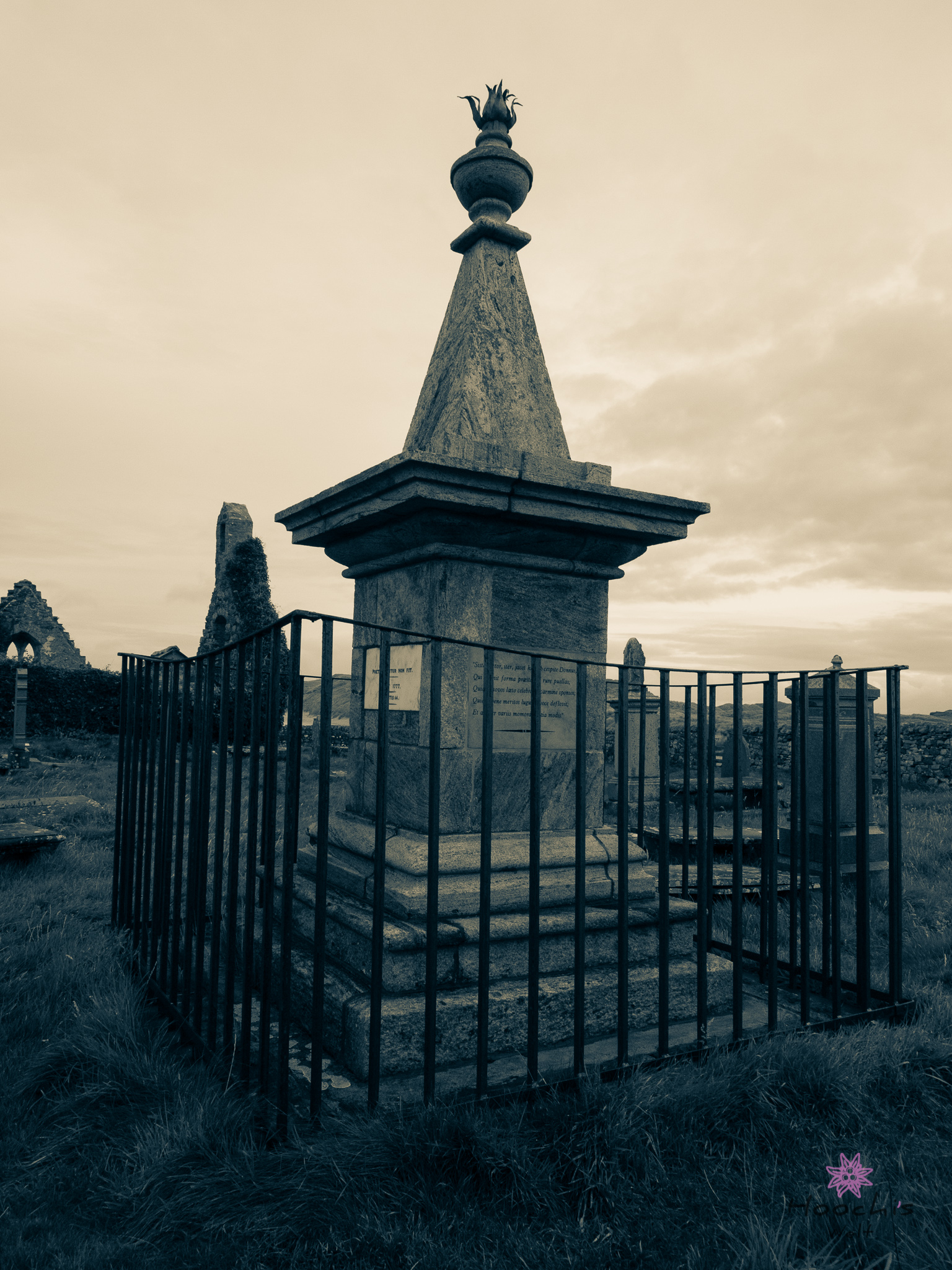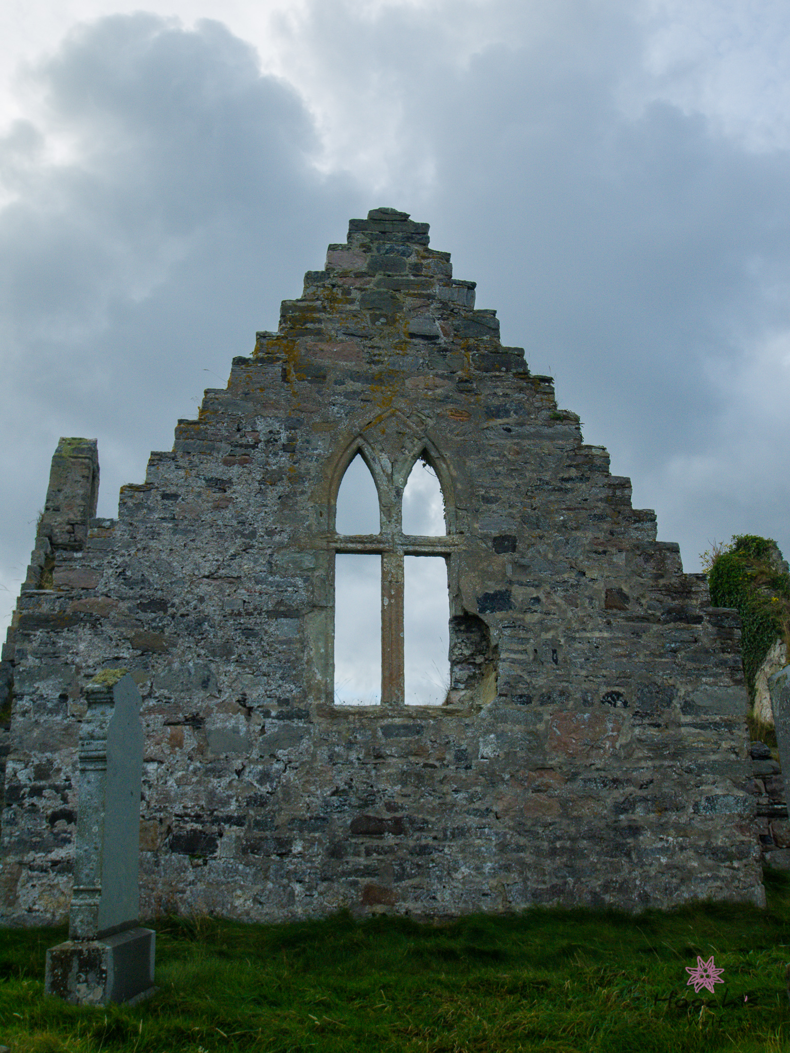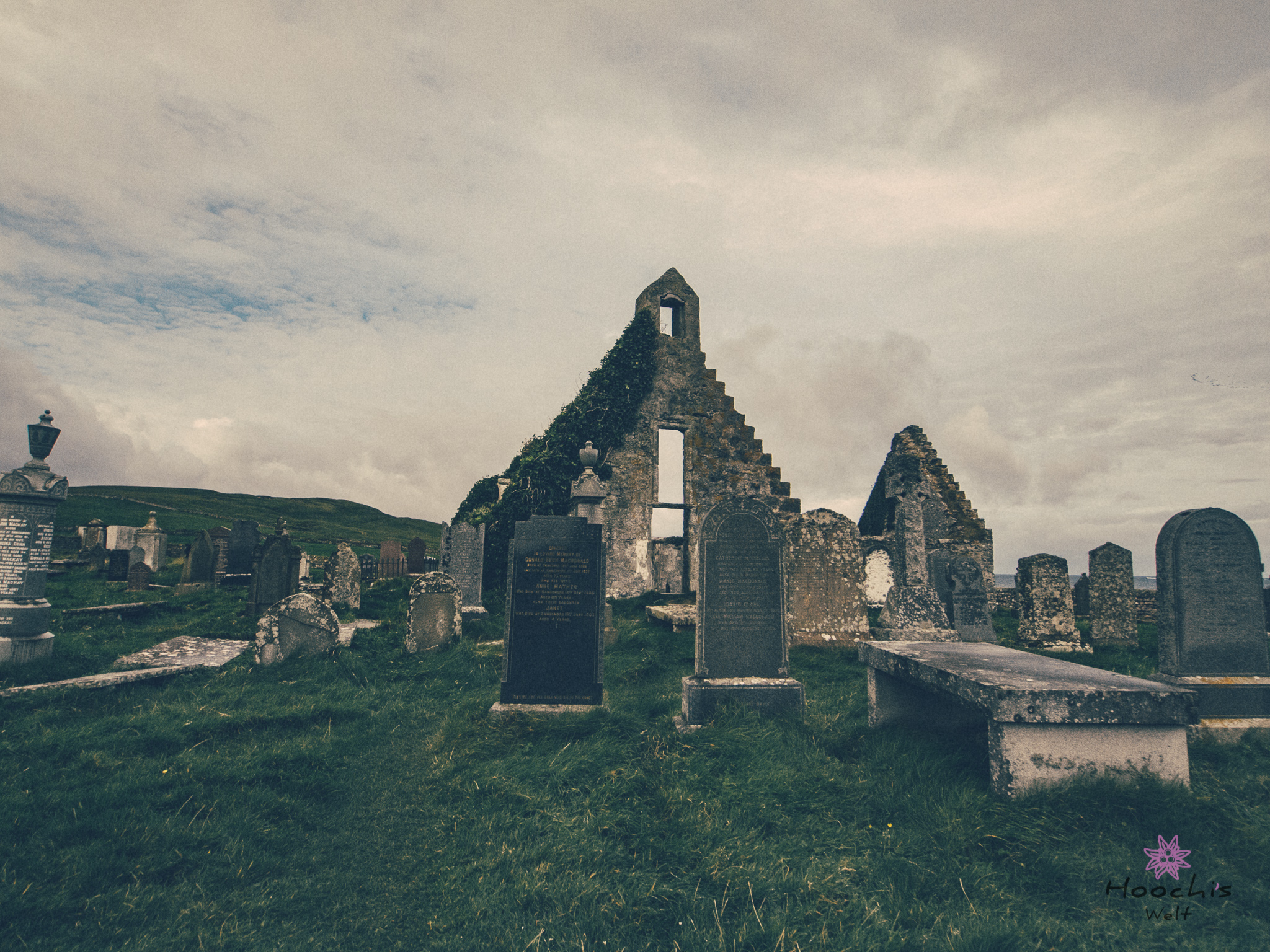 Flo und ich suchten mehrmals den Friedhof nach dem Grabstein von McMurdo ab und wir fanden nichts. Es gab zu viele, die mit Moos zugewachsen sind. Erst bei den Recherchen zu Hause stellte ich fest, dass ich doch das Grab gefunden und sogar fotografiert hatte. Wir suchten außerhalb der Kirchenruine, dabei ist es direkt am Eingang auf der linken Seite.