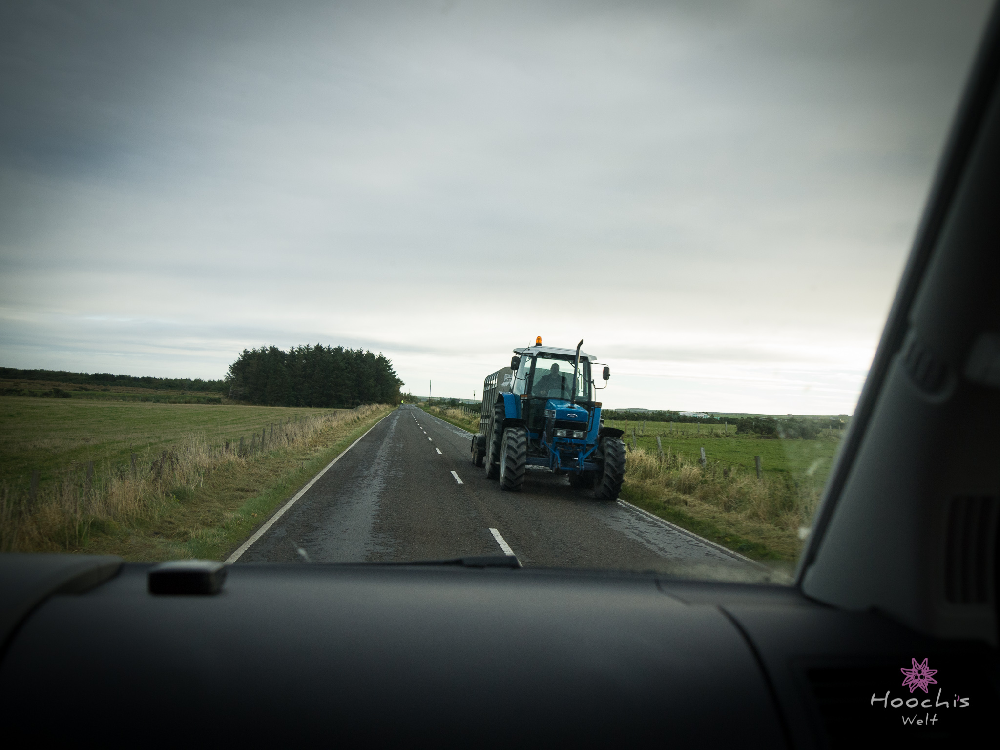 Bruno fegte die Straße entlang und es wurde landschaftlich spürbar, dass es in den Norden ging. Die Highlands mit den Unebenheiten lag nun hinter uns. Es herrschten geordnete Verhältnisse: Gerade Felder, Tiere auf abgesteckten Weiden.