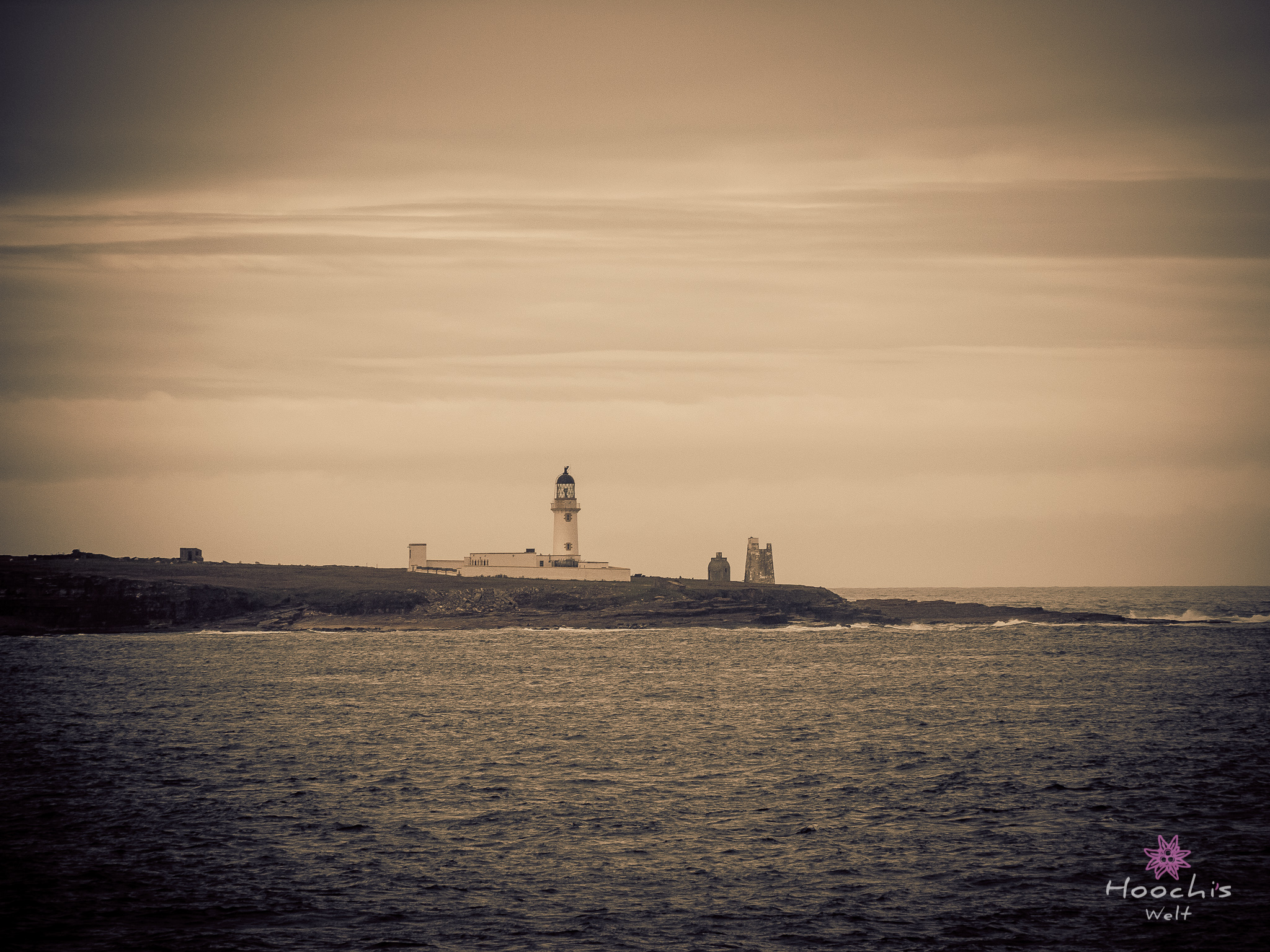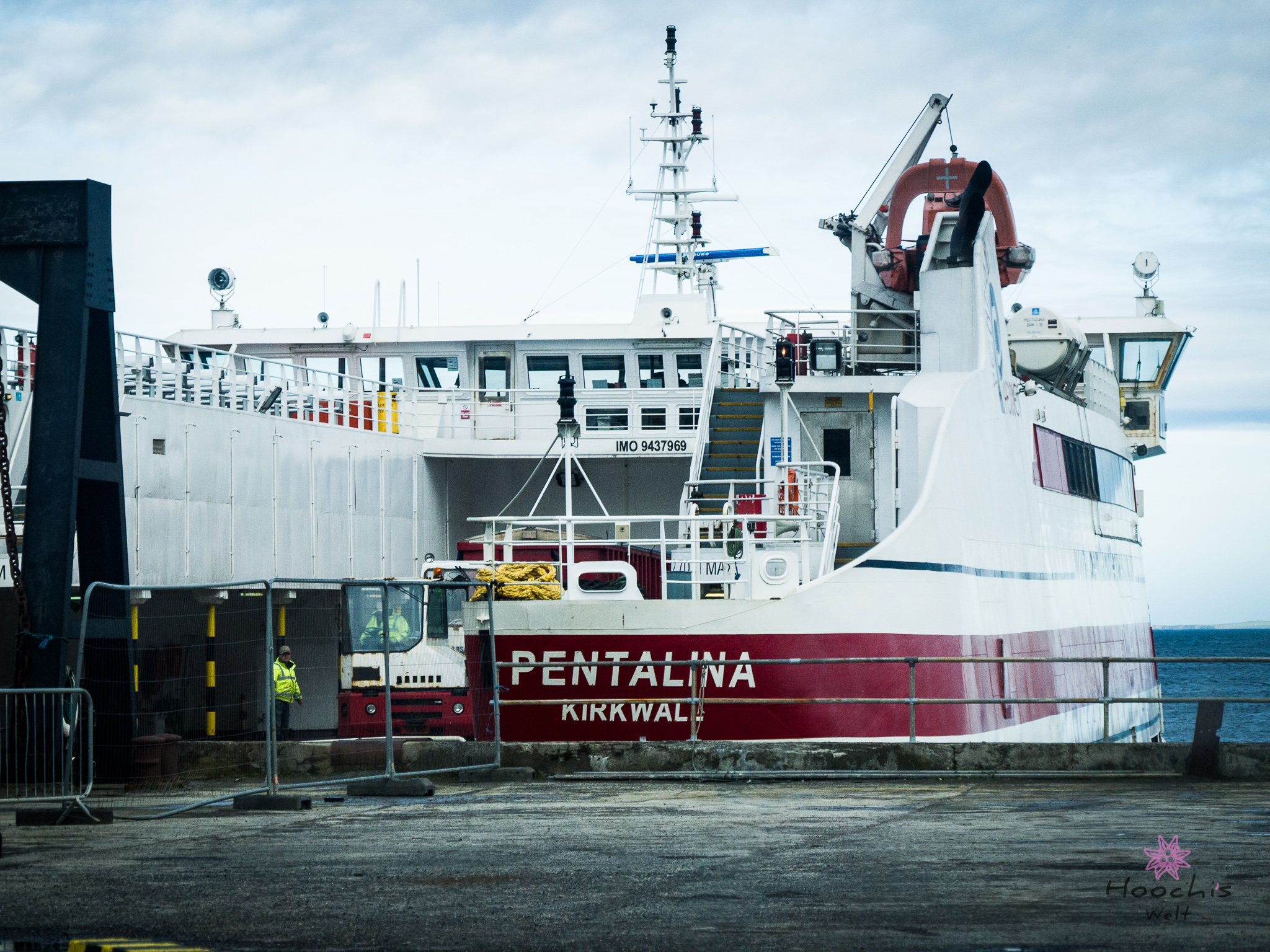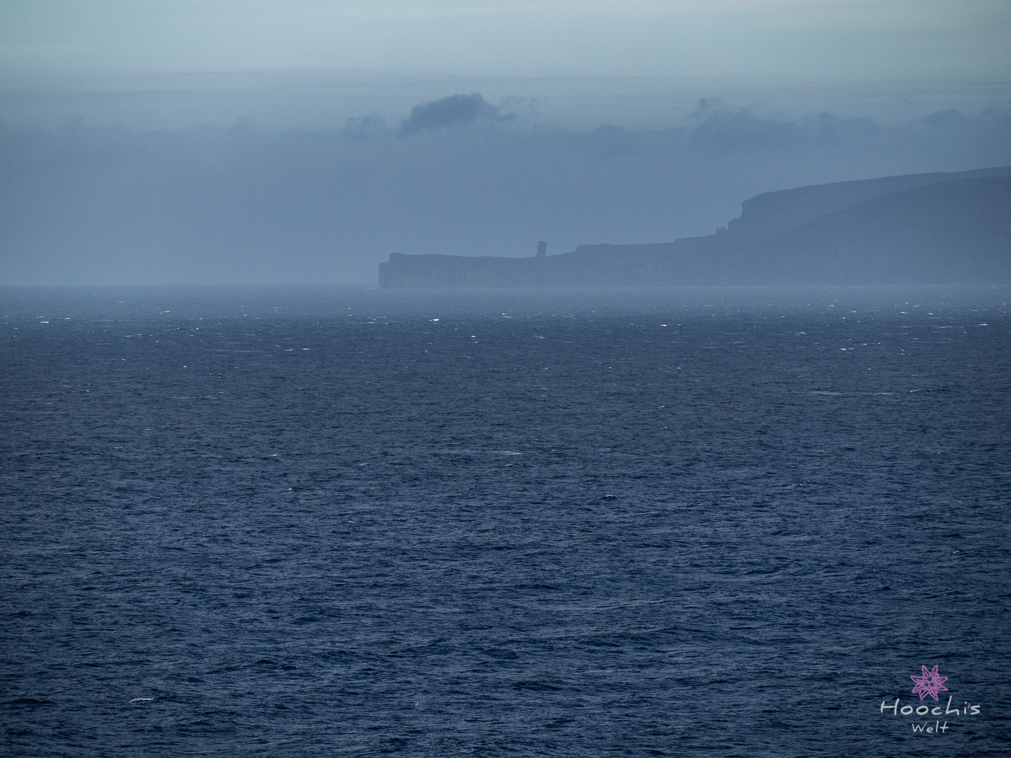 Vollgetankt bis oben hin fuhren wir nach Gills zurück und buchten die Überfahrt. Mit 65£ und einer Stunde überfahrt war sie deutlich günstiger als die Fähre von Thurso aus. Da wir noch genügend Zeit hatten fuhren wir wieder zurück zum Dunnet Head und sahen uns den nördlichsten Punkt an. Zurück am Hafen mussten wir noch warten, da die Fähre noch nicht zu sehen war. Dies änderte sich aber schnell und wir konnten uns in die Fahrzeugschlange einreihen und auf das Schiff fahren. Wie schon gesagt, die Überfahrt dauerte eine Stunde. Für mich allerdings dauerte sie viel länger. Durch den enormen Wellengang wurde mir nach kurzer Zeit schon flau im Magen. Ich aß einen Müsliriegel und dadurch wurde es deutlich besser. Flo hatte seinen Spaß und konnte die Fahrt genießen. Er meinte zu mir, ich sei ganz blass und ob es mir wirklich gut ginge… Nein, ich brauche keinen Anti-Seefahrt-Übelkeits-Kaugummi. 😀