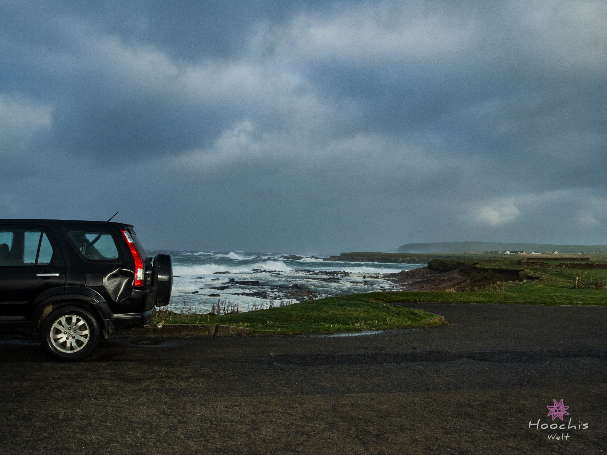 Es stürmte und regnete. Welcome to Orkney! Wir blieben liegen, bis die Blase spürbar war. Wir räumten den Bus gemütlich auf und kochten in aller Ruhe Kaffee. In der Hoffnung, dass das Wetter besser wurde. Es bestand Sturmwarnung.