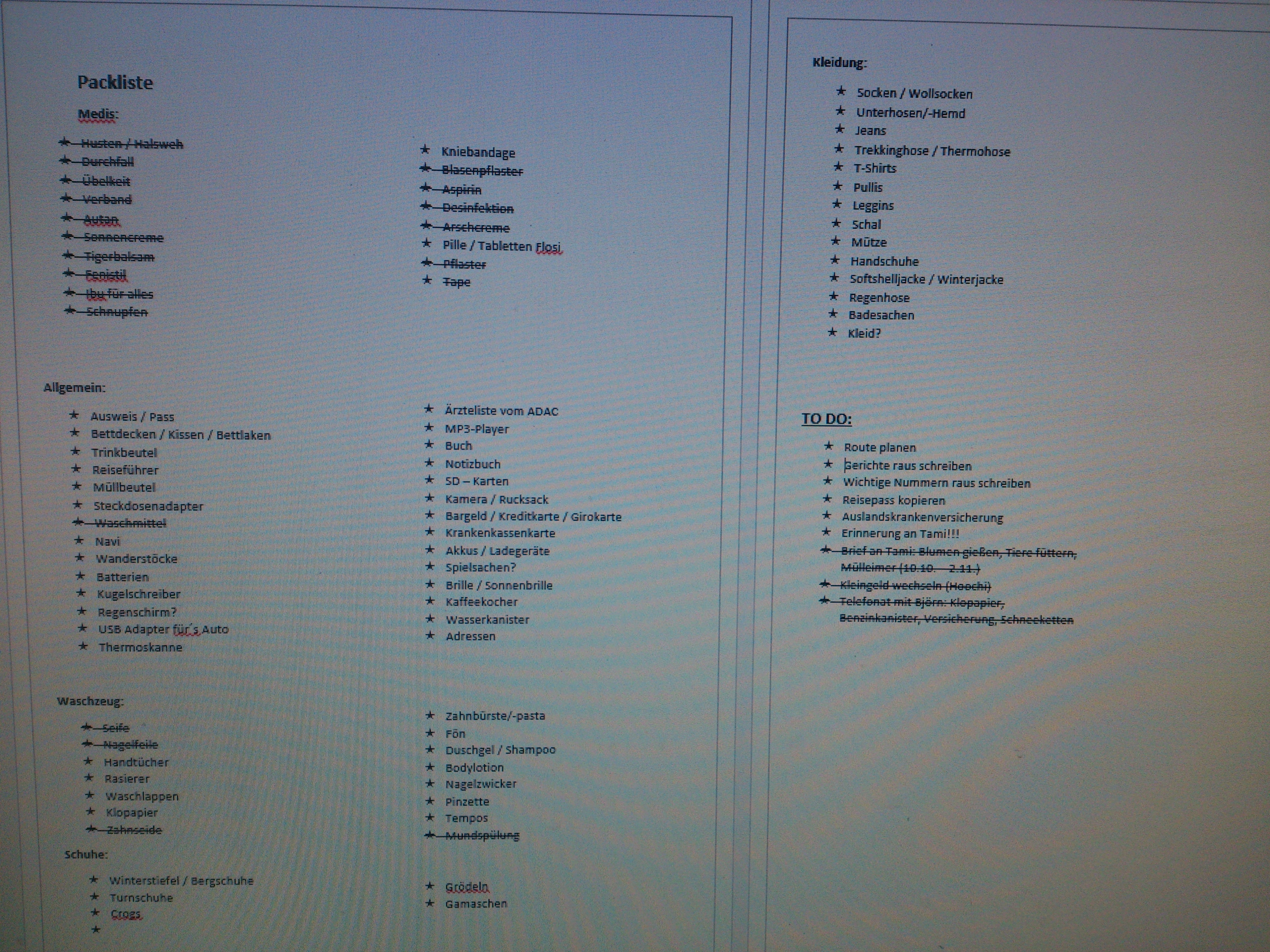 Die Packliste ist soweit auch fertig. Mein Freund bekommt schon die Krise. Dabei finde ich sie gar nicht so lange. Immerhin sind wir 3 Wochen unterwegs. Was meinst du?