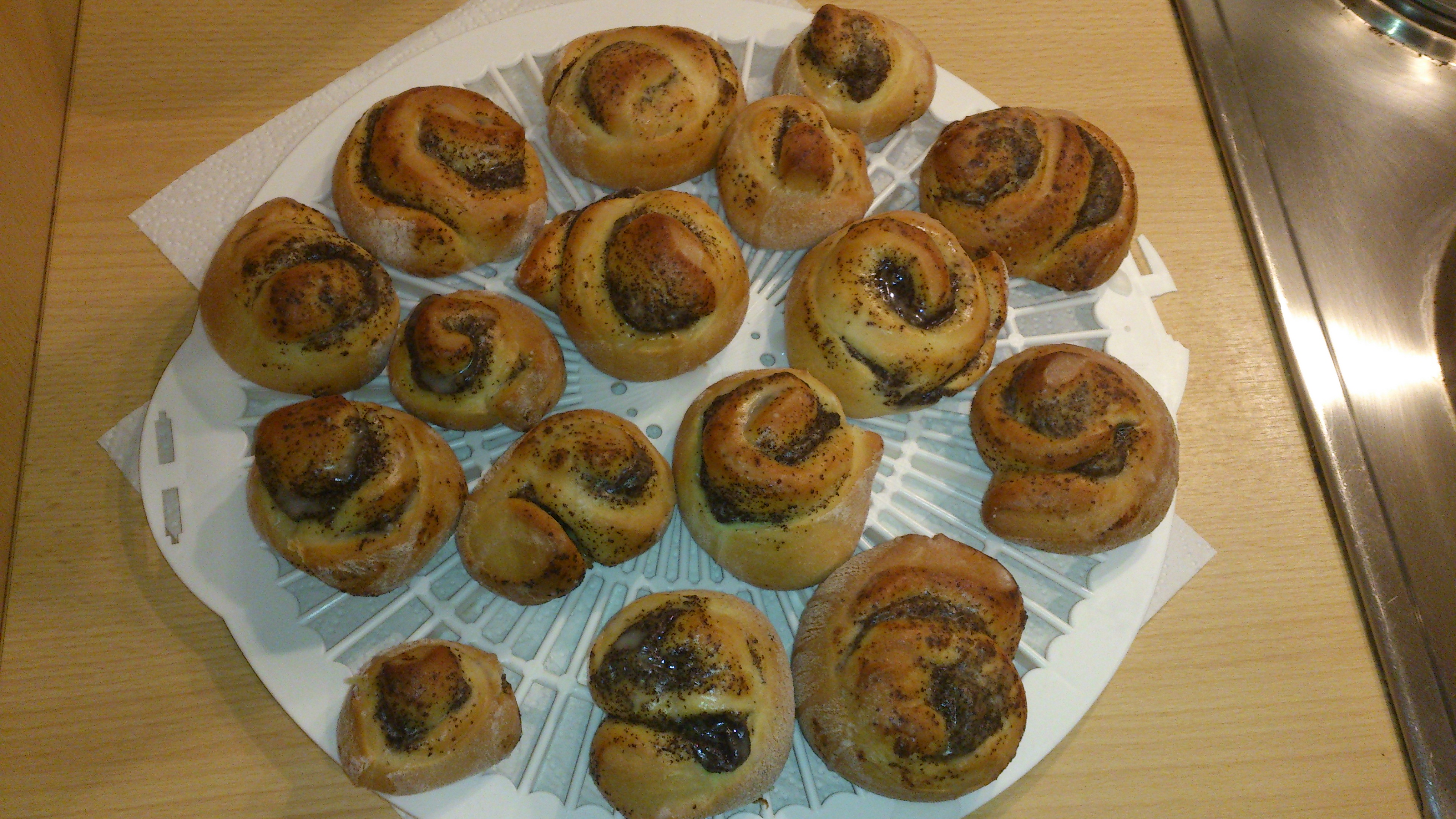 Den Zuckerguss in einen Spritzbeutel mit kleinster Öffnung oder ein Plastikbeutel, von dem man eine kleine Ecke abschneidet, füllen und Streifen über die Mohnschnecken ziehen.P1120343