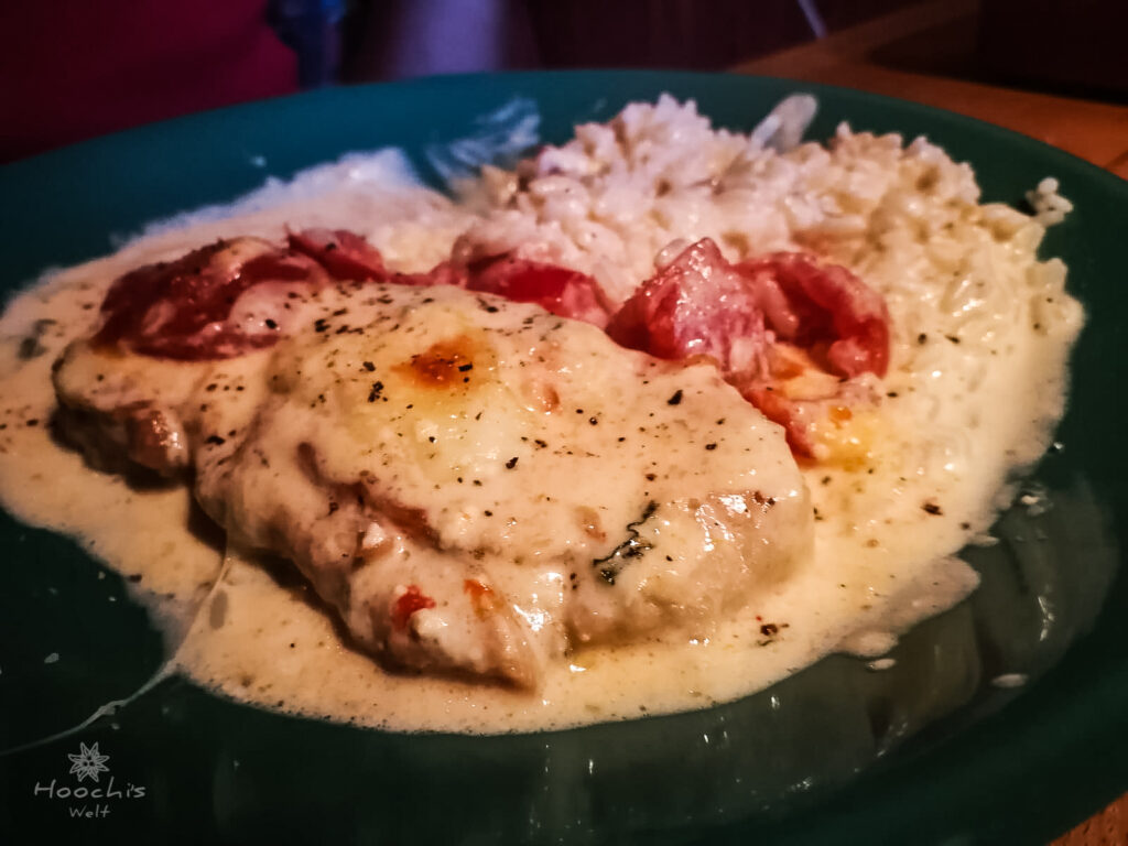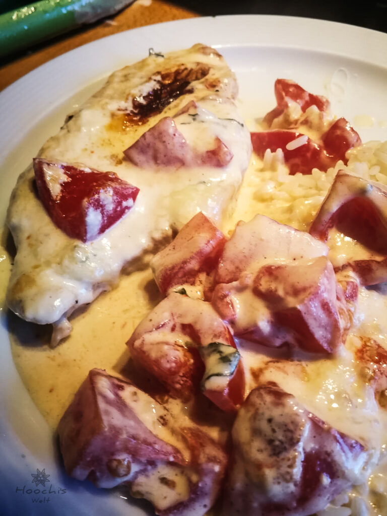 Fleisch und Tomaten in eine gefettete Auflaufform geben. Sauce darüber gießen. Mozzarella in kleine Stückchen schneiden und auf dem Fleisch verteilen. Wer mag, kann noch geriebenen Parmesan und 1 EL Kräuterbutter in kleine Flöckchen darauf verteilen. Im vorgeheizten Ofen bei 175 Grad bei Umluft ca. 30 Min. backen. Herausnehmen und mit restlichem Basilikum bestreuen.