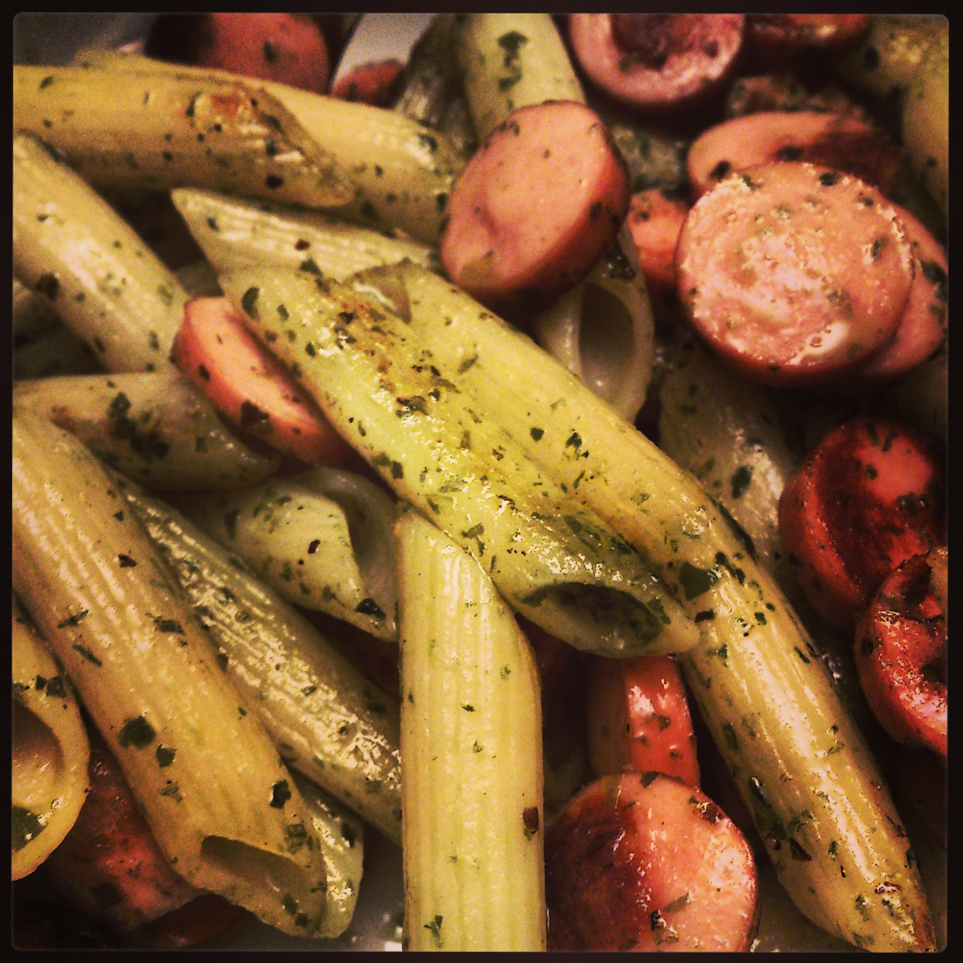 Zum Abendessen gab es Spaghetti. Das geht auch mit einer Hand super zu essen.