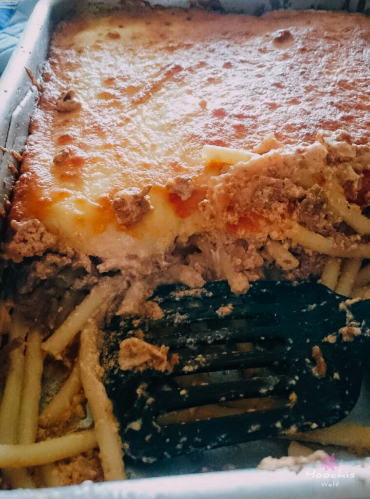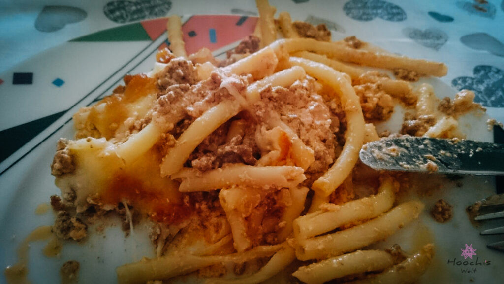 Ich wurde bekocht und es gab den Nudelauflauf mit Hackfleisch. Netterweise wurde mir das Rezept überlassen und ich kann es euch präsentieren. Die Menge sollte für 4 Personen sein, aber wir bekamen die Auflaufform nicht leer. 🙂