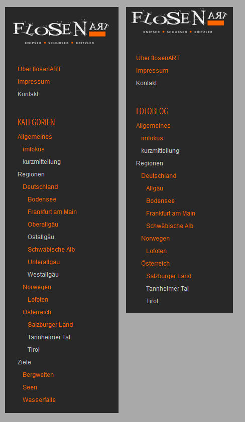 Servus miteinander! Das floSen hat die letzten Nächte ein wenig an seinem Blog gearbeitet. Aus Grau, Orange, Weiss und Beige wurde ein einheitlicher Grautonmix mit „flosen“-Orangeakzenten. Die Bilder sollen schließlich im Vordergrund stehen und die Blicke auf sich ziehen. Was sich im Detail geändert hat, erzähl ich Euch kurz und knapp im Folgenden.